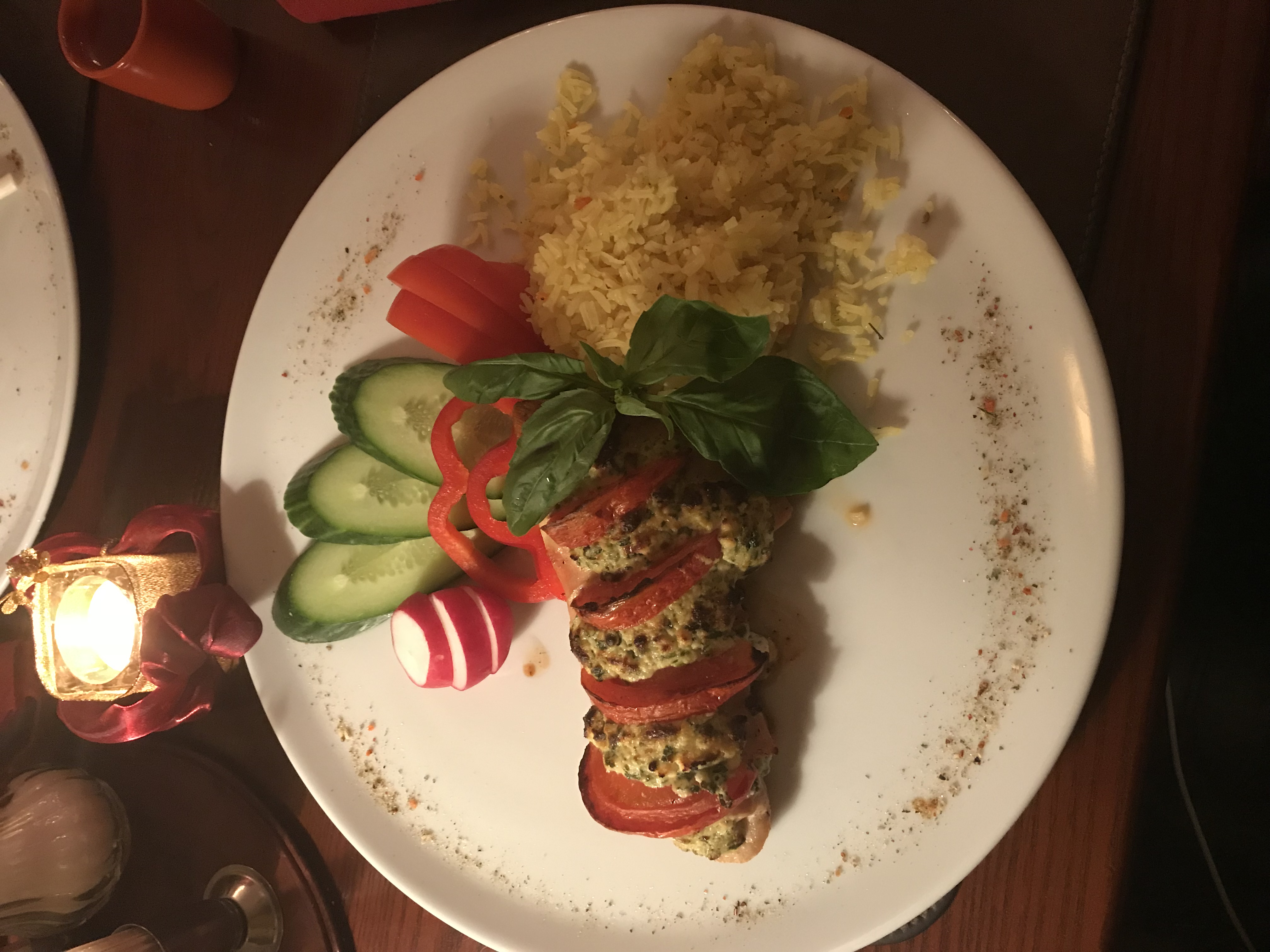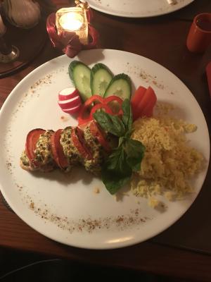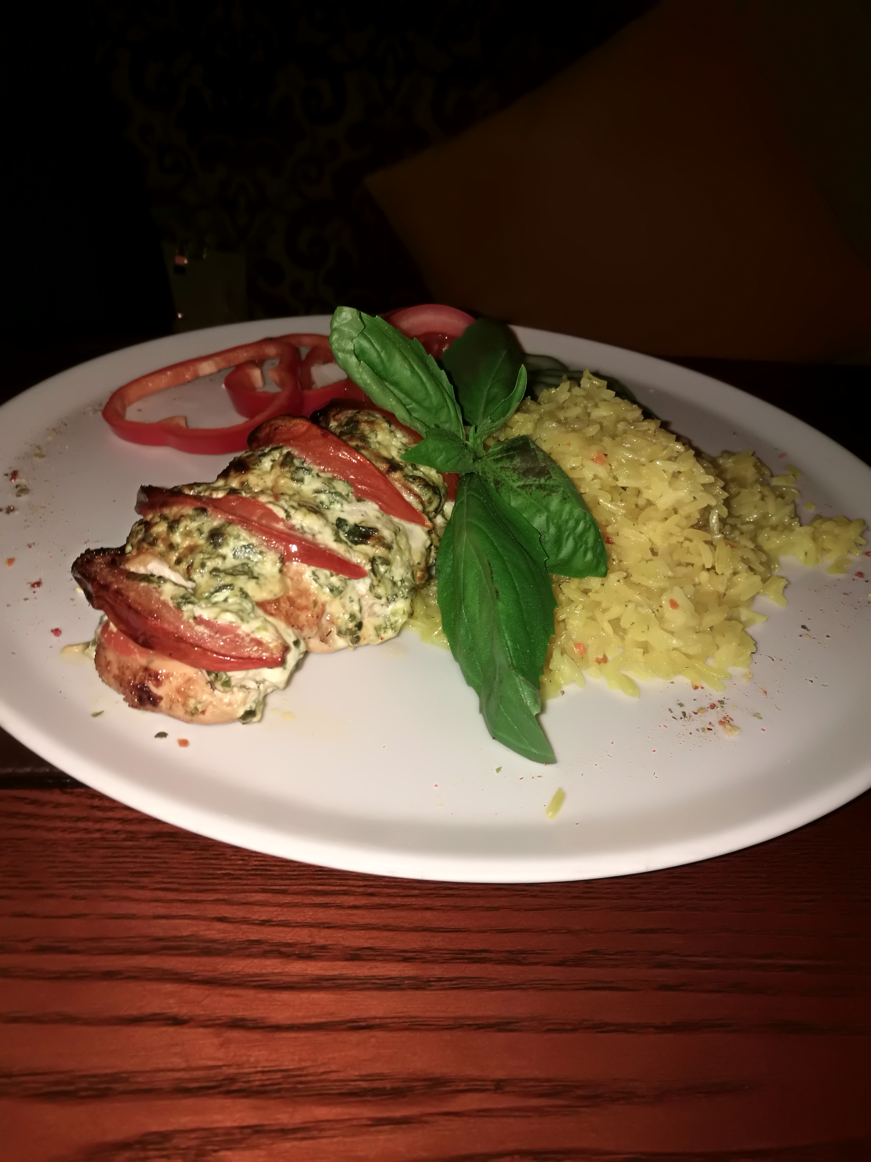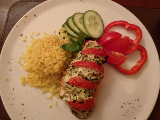 Филе цыпленка запеченное с рикоттой и шпинатом (240/1) с рисом (180)