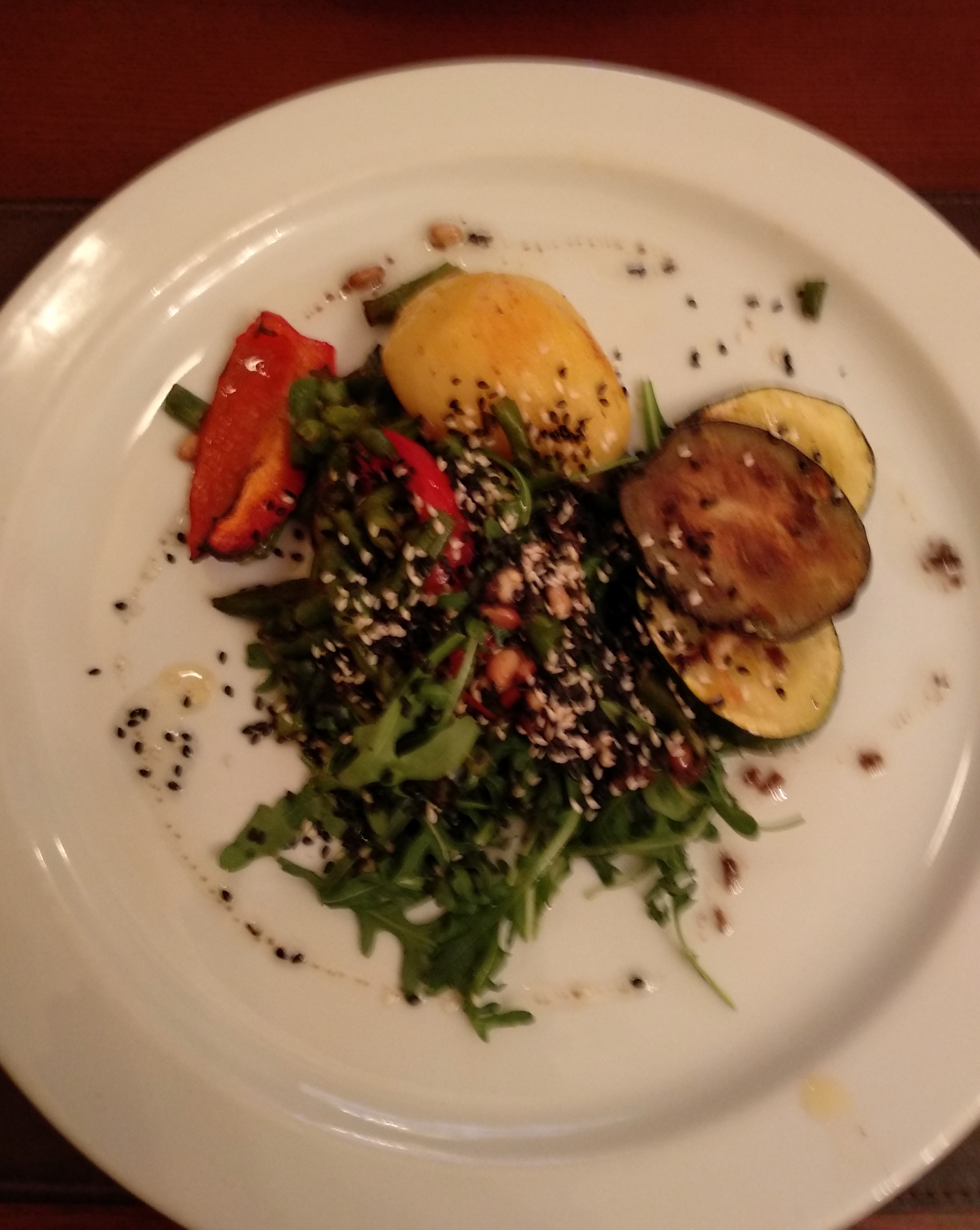 Теплый салат из печеных овощей с рукколой и соусом с кедровыми орешками (180/15/10/1)