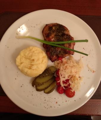 Корейка из свинины на косточке (160/40/30) с гарниром из картофельного пюре с домашними солениями (200/50/50/50)