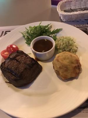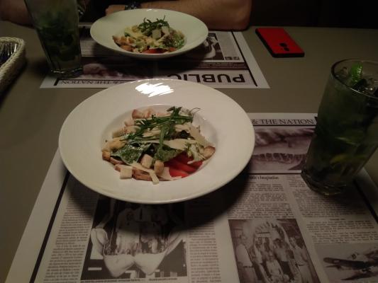- салат с прошутто и дор блю (2 порции, по 200 г): салатный микс, прошутто, киви, сыр дор блю, грецкий орех, томаты черри, пшеничные сухарики, медово-горчичная заправка