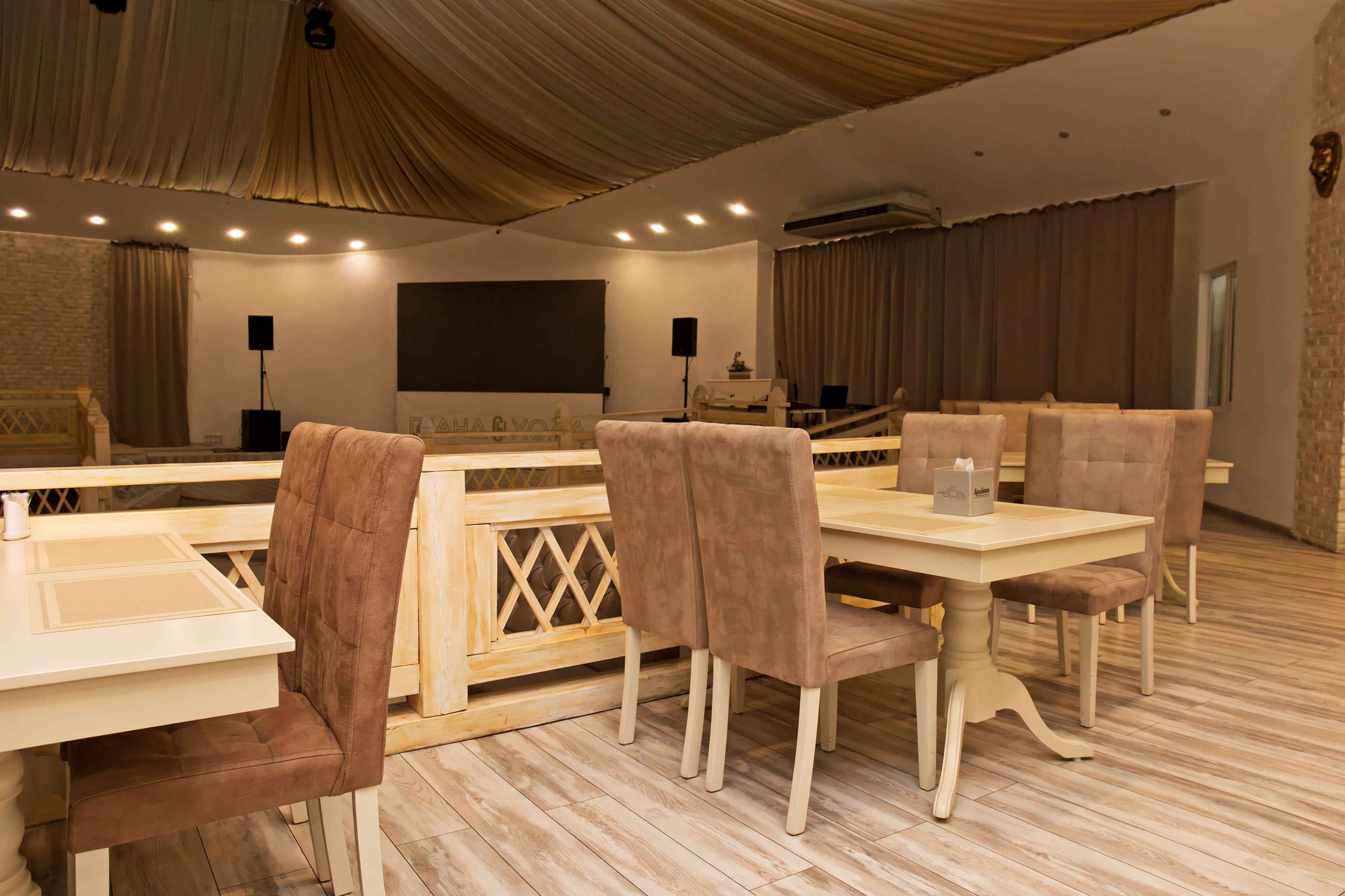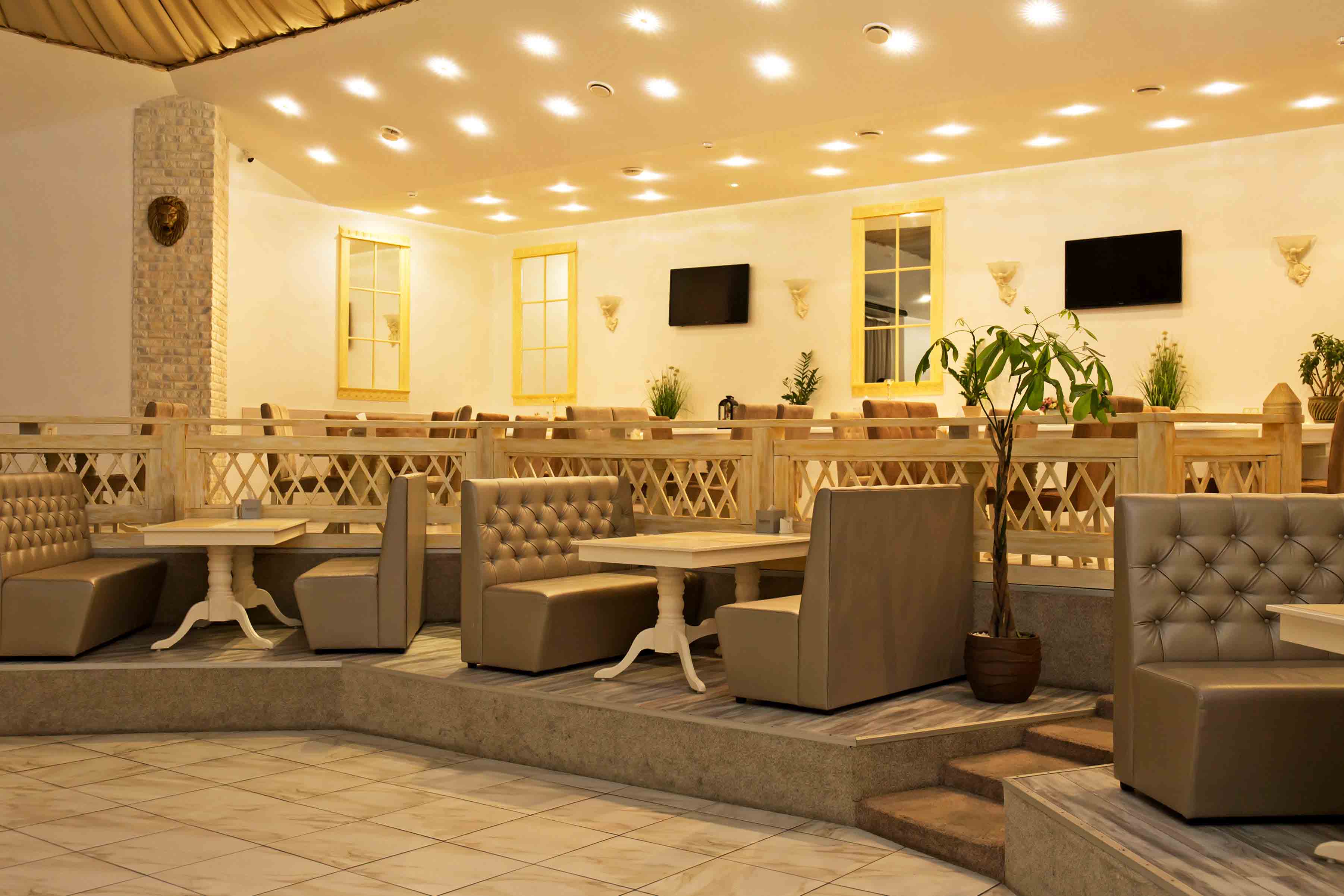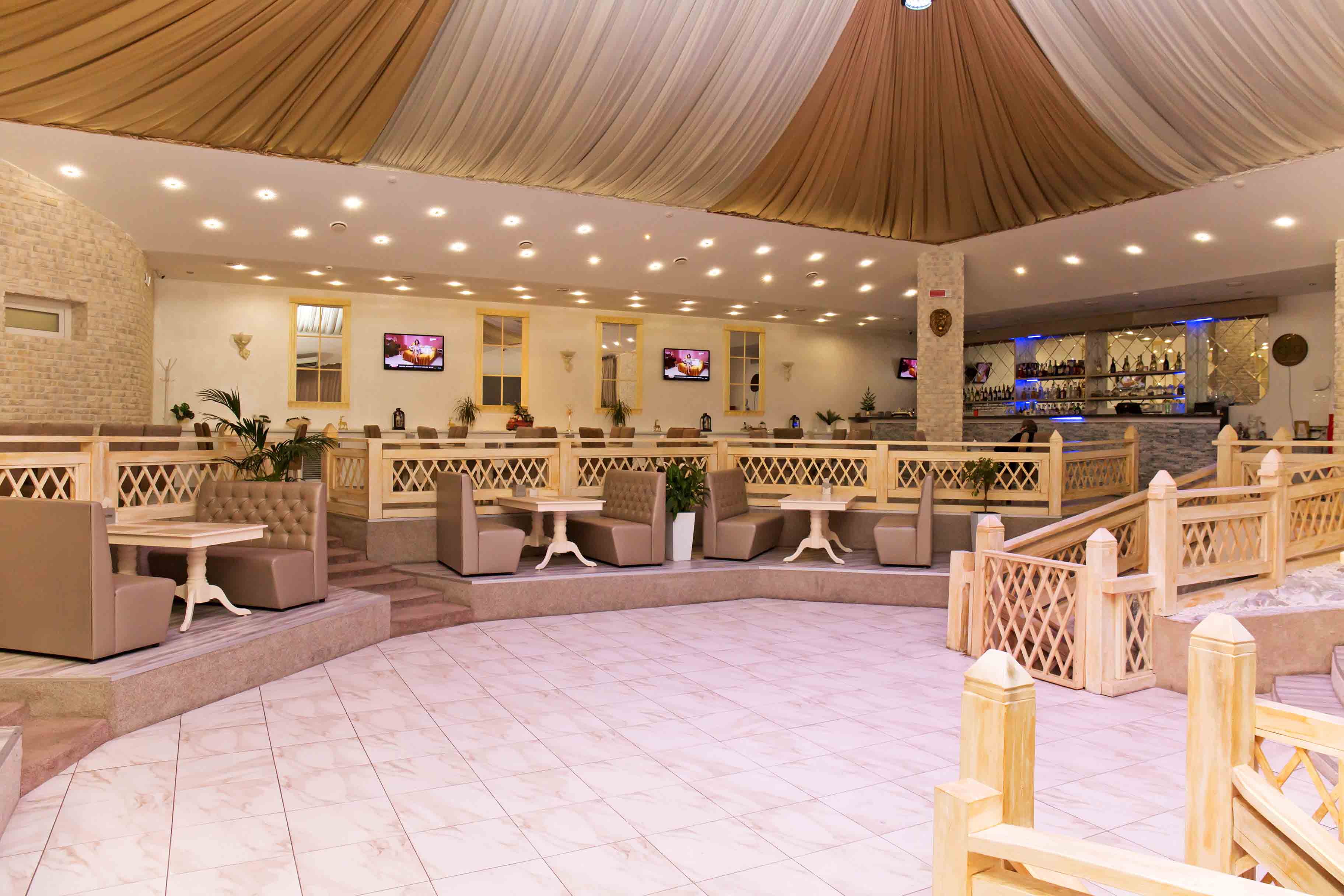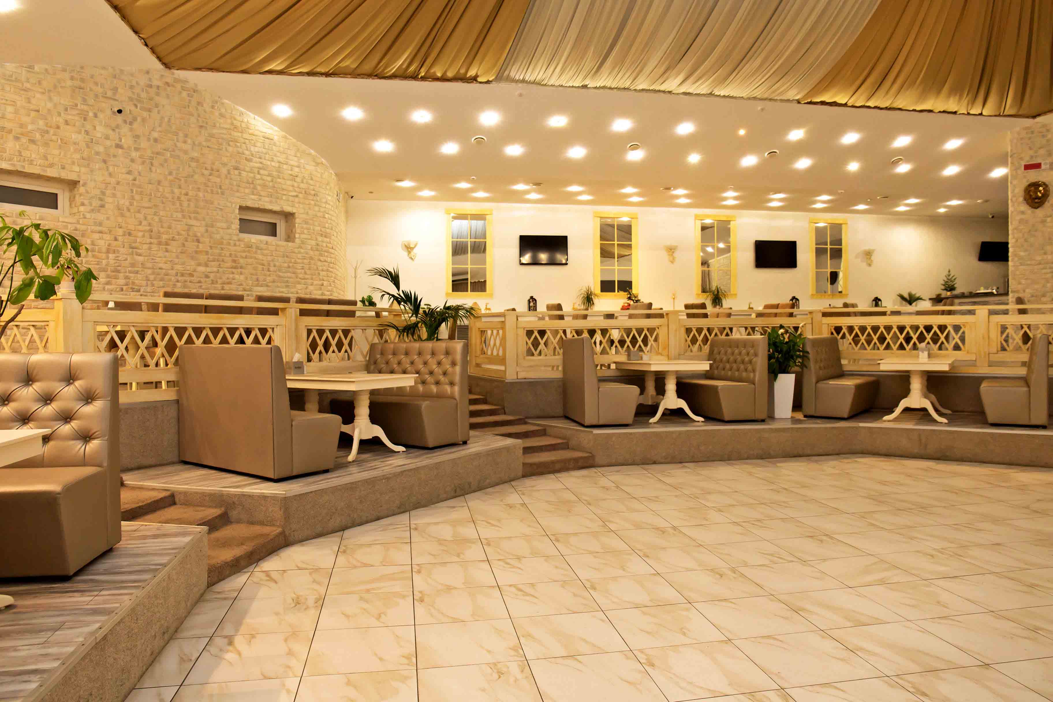 Интерьер оформлен в классическом стиле, где гармонично сочетаются контрастные и пастельные тона. Уместная роскошь внутренней отделки подчеркивается украшением зала, а также сочетанием парящего потолка под куполом из шелка и декора светильниками из Франции. Отдельного внимания заслуживают картины и световые инсталляции.