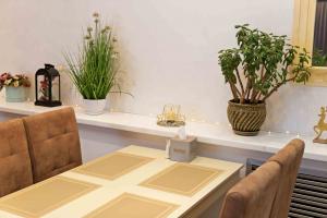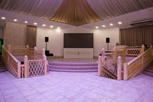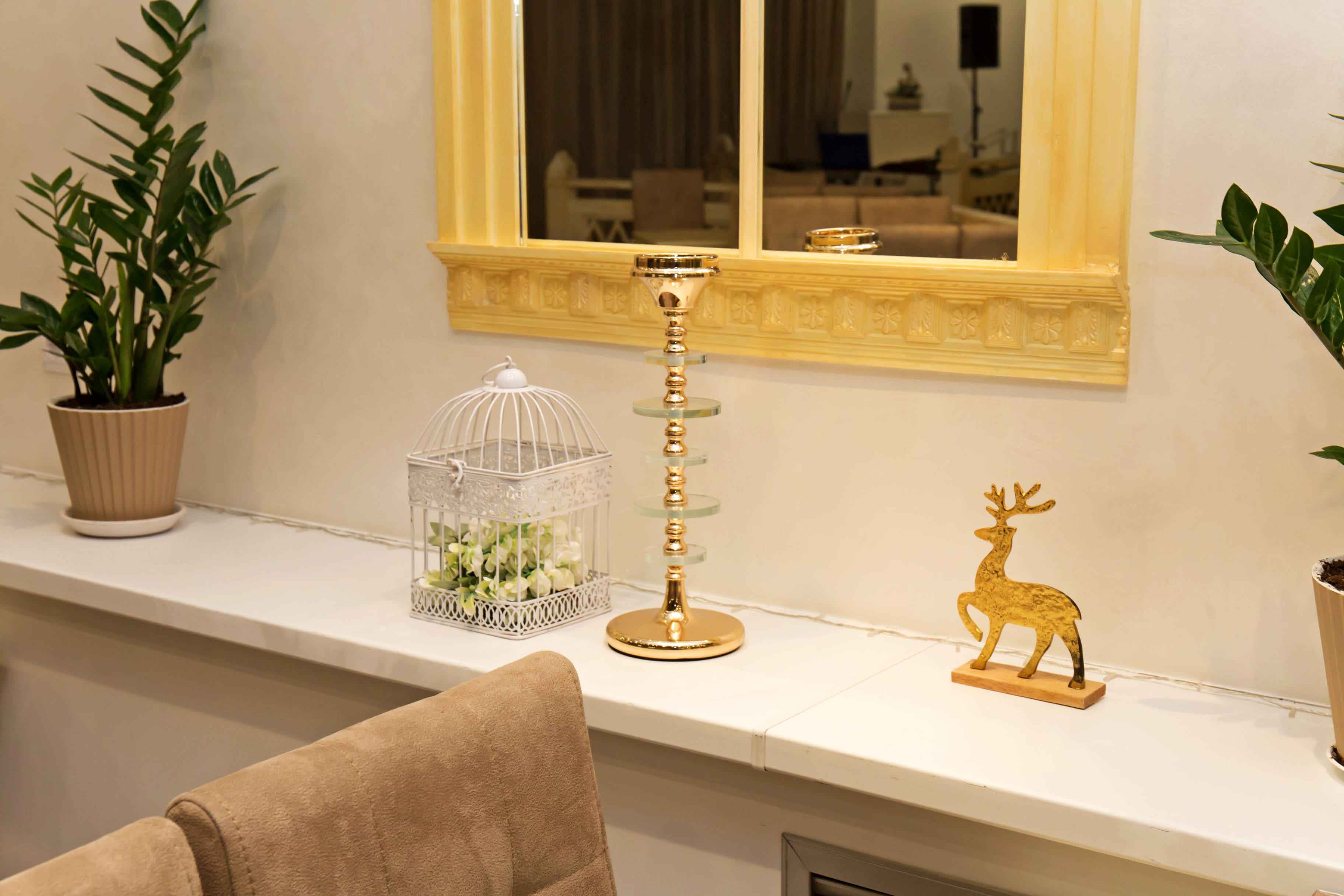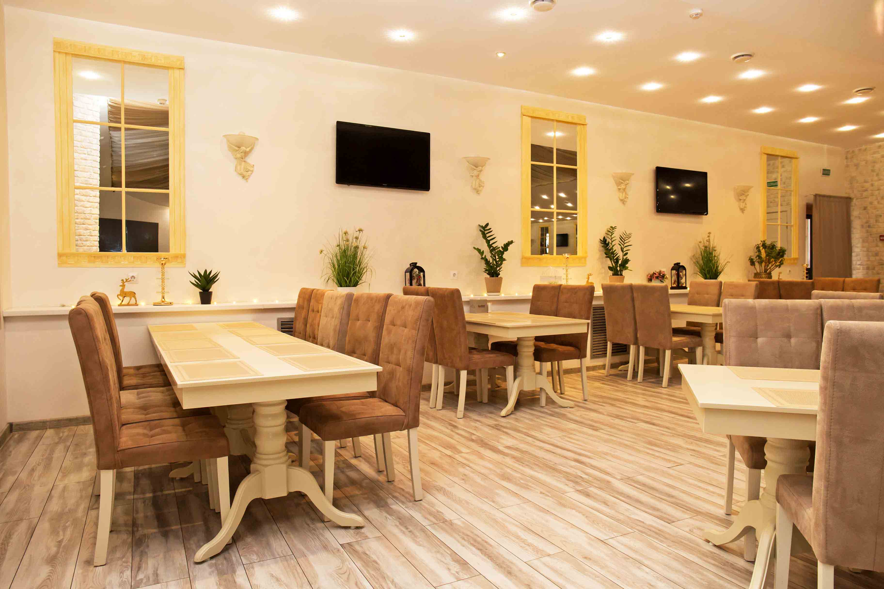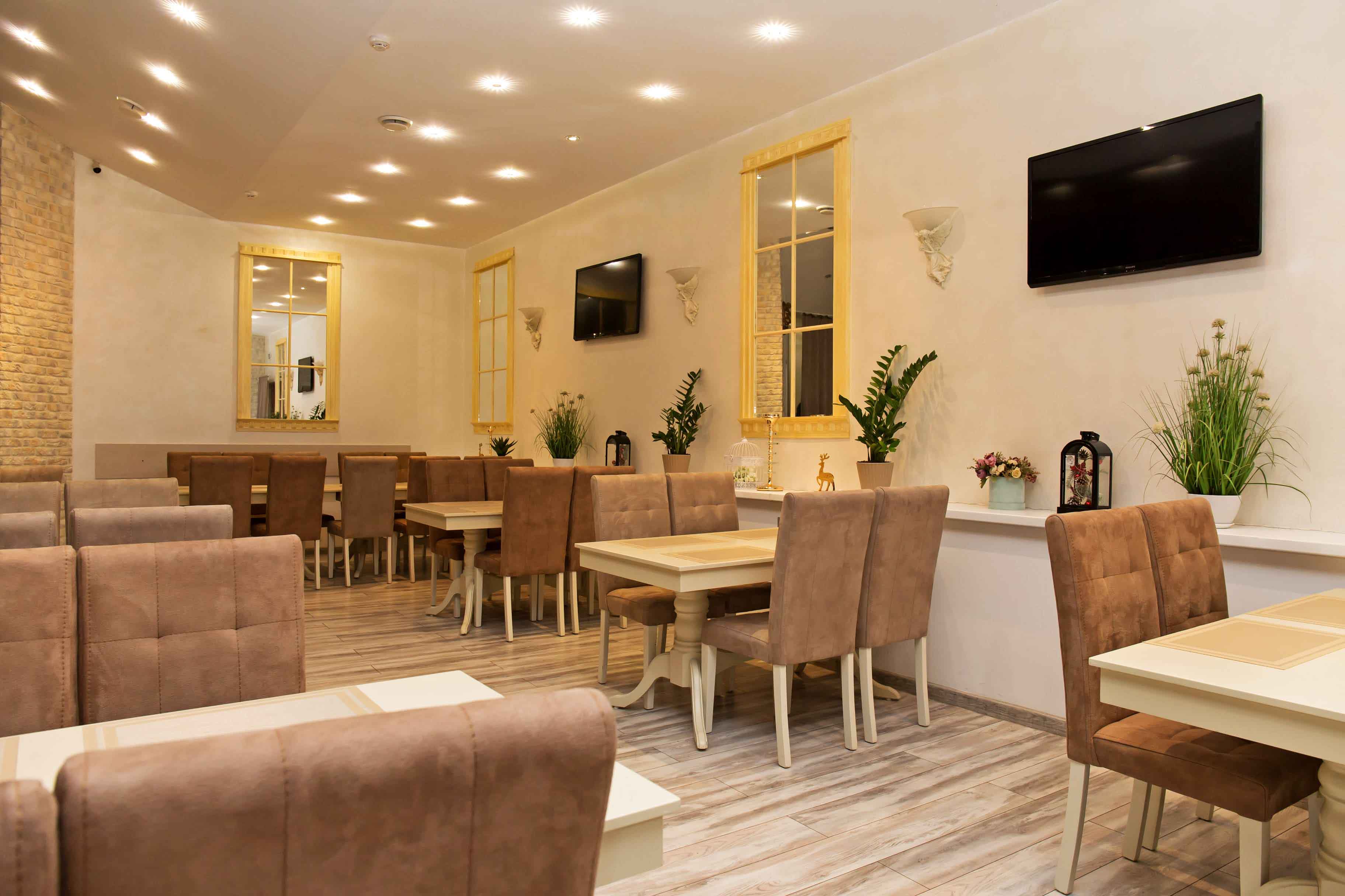 Интерьер оформлен в классическом стиле, где гармонично сочетаются контрастные и пастельные тона. Уместная роскошь внутренней отделки подчеркивается украшением зала, а также сочетанием парящего потолка под куполом из шелка и декора светильниками из Франции. Отдельного внимания заслуживают картины и световые инсталляции.