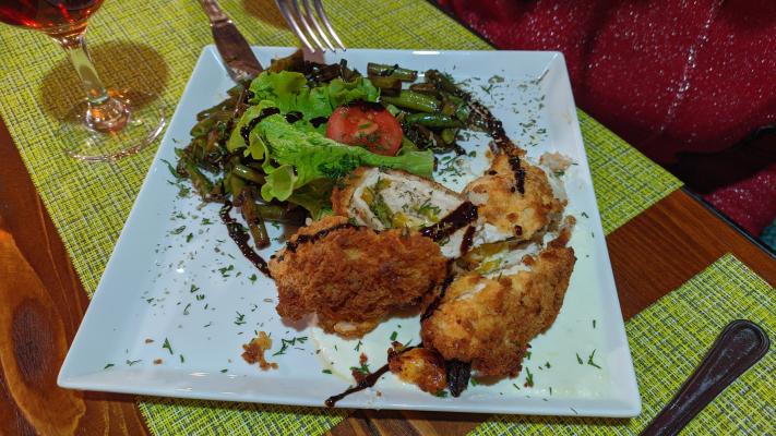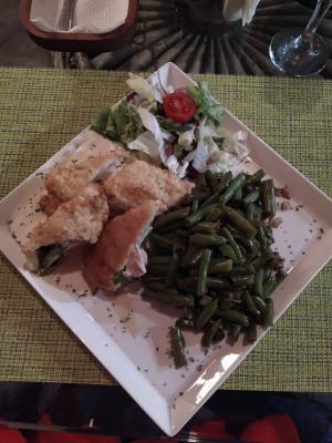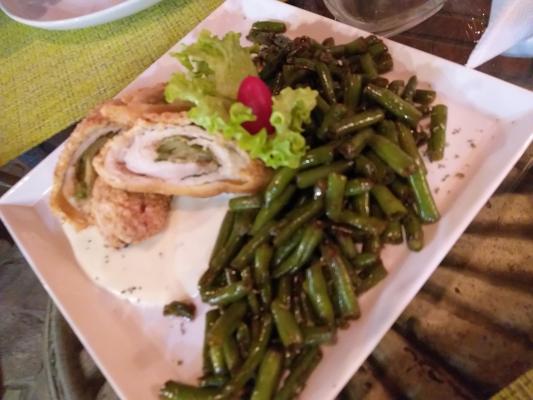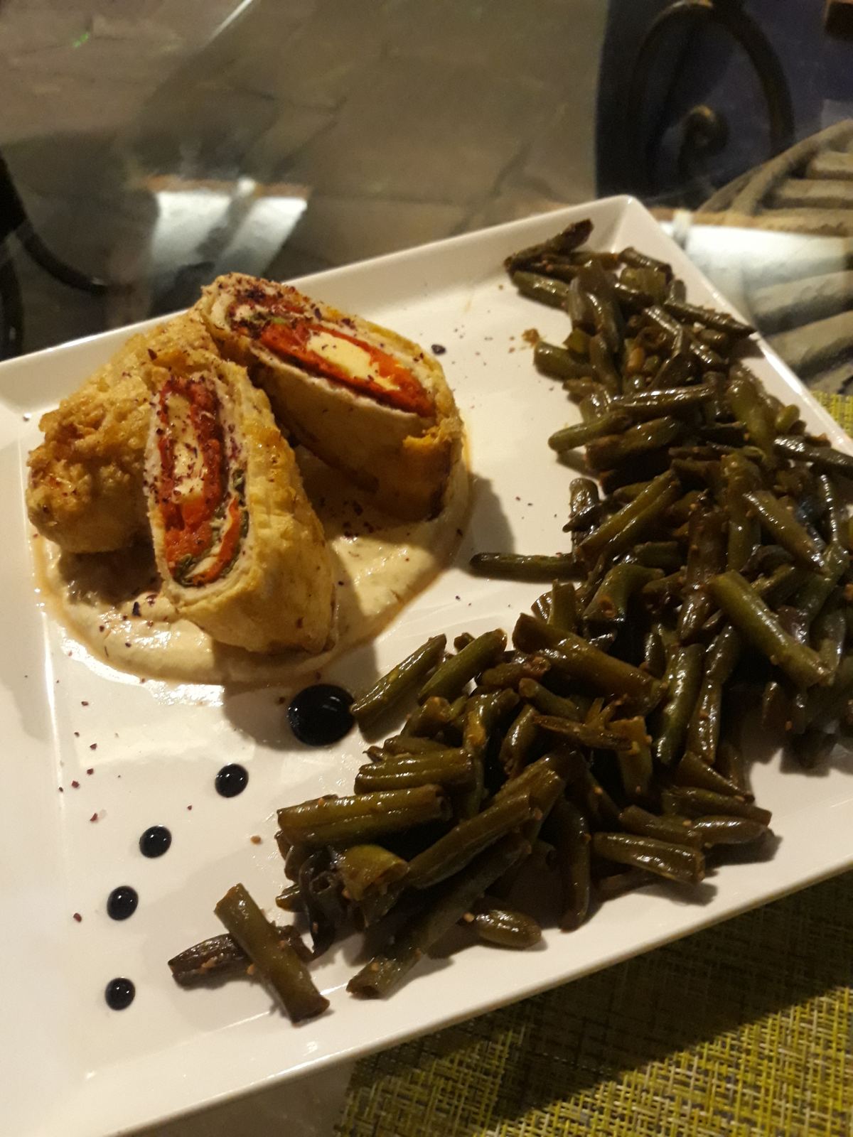 Рулетики- филе куриное, лист салата, перец маринованный, панировка, соус сливочный, гарнир - фасоль спаржевая, микрозелень, украшения