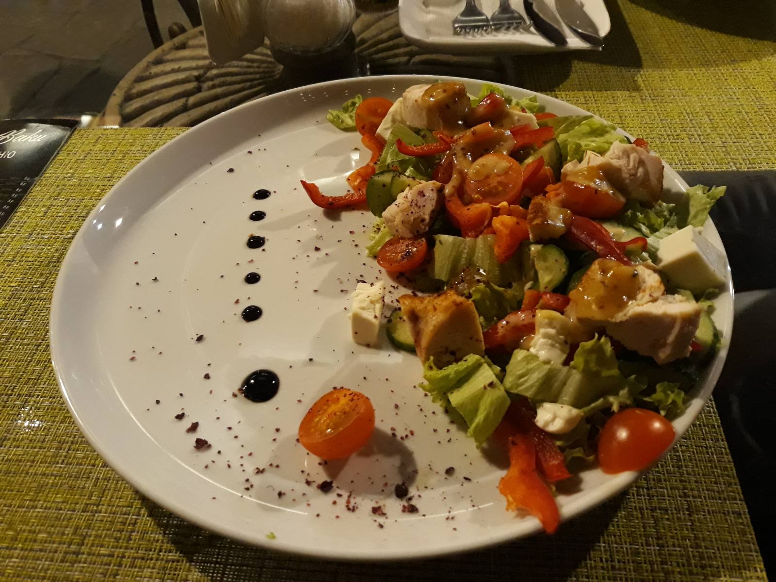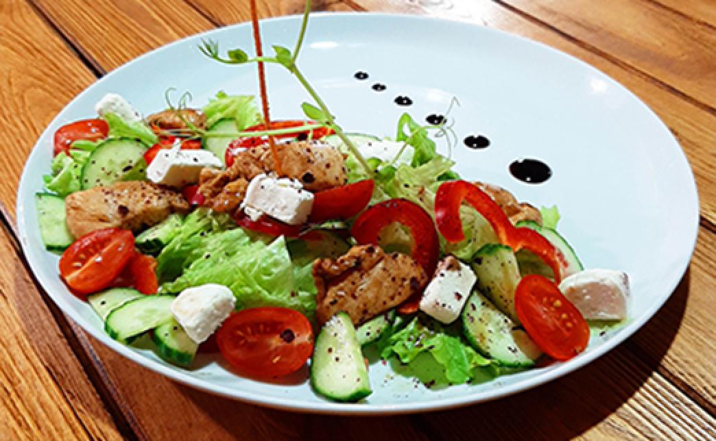 Куриное филе (обжаренное), салат, помидоры черри свежие, перец сладкий свежий, огурец свежий, сыр "Фета", соус медово-горчичный, микрозелень, украшения