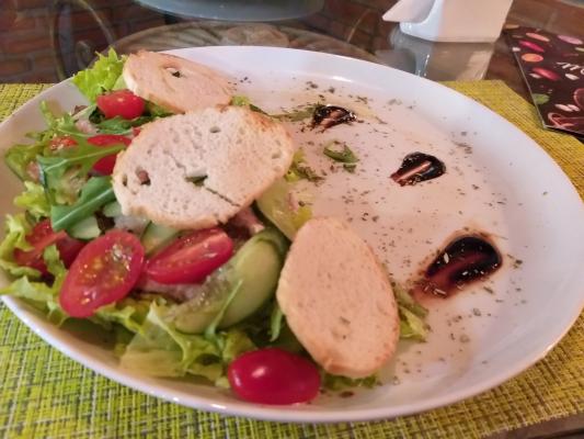 Филей свиной (обжаренный), салат, помидоры черри свежие, огурец свежий, сухарики, соус "Свежесть" (с киви), украшения