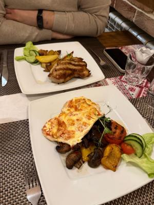 Салат "Греческий" (200 г) - 1 порция Салат "Фирменный" с говядиной (200 г) - 1 порция Филе куриное "Паночка" с овощами-гриль (380 г) - 1 порция Стейк из свинины с картофелем по-деревенски (300 г) - 1 порция Десерт (на выбор, 150 г) - 2 порции Игристый напиток (750 мл) |