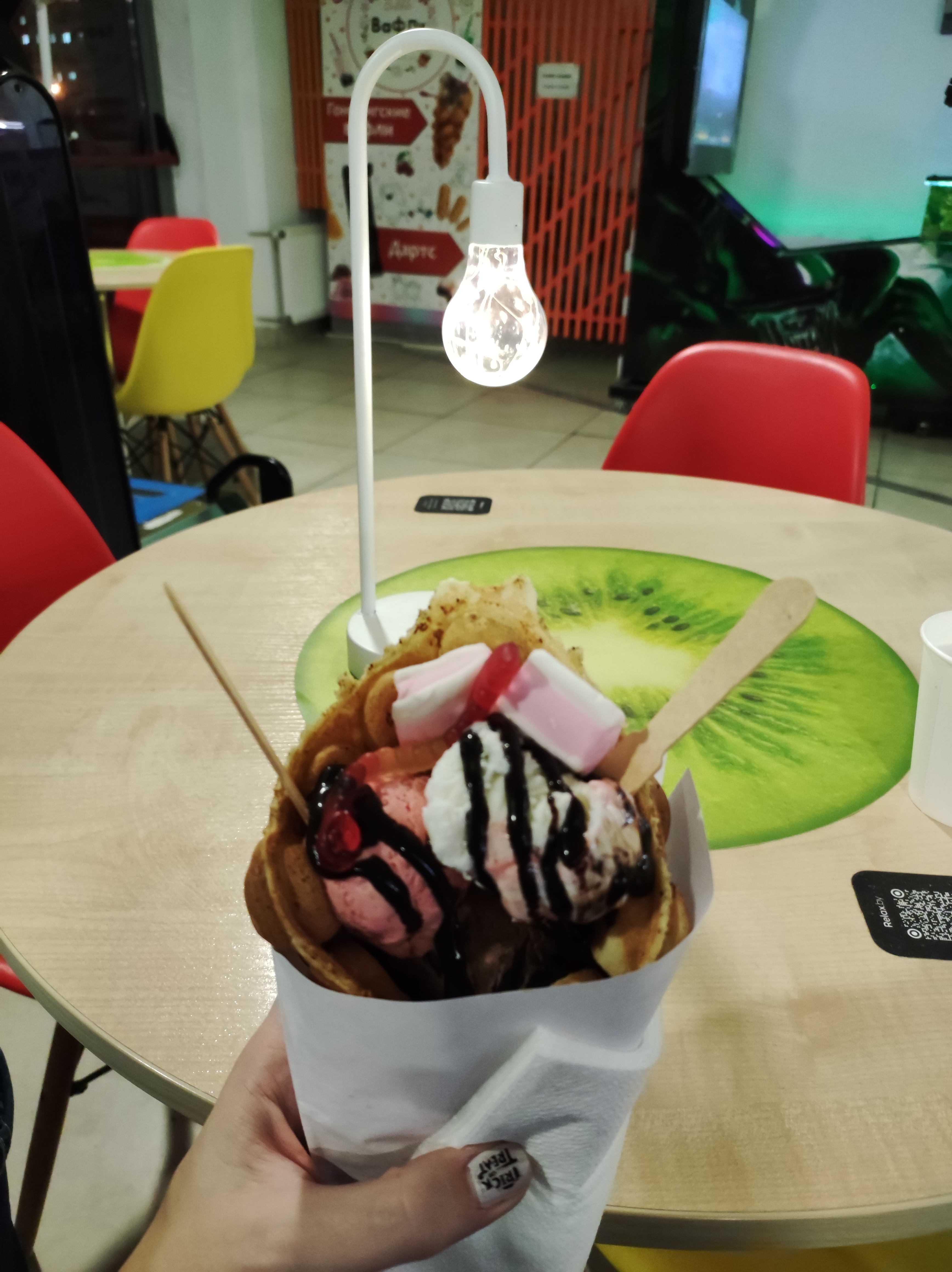 - позитивная вафля (вафля ваниль, в шариках M&M’s, мороженое, топпинг) + кофе (наличие уточняйте): 11 р. 14 р.