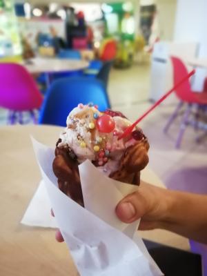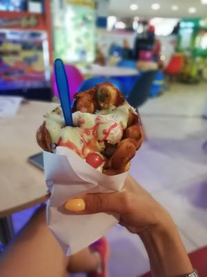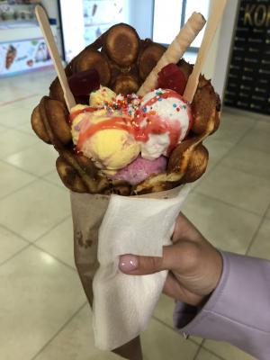 - классическая вафля (вафля, мороженое, топпинг, посыпка) + кофе (наличие уточняйте): 10 р. 13 р.