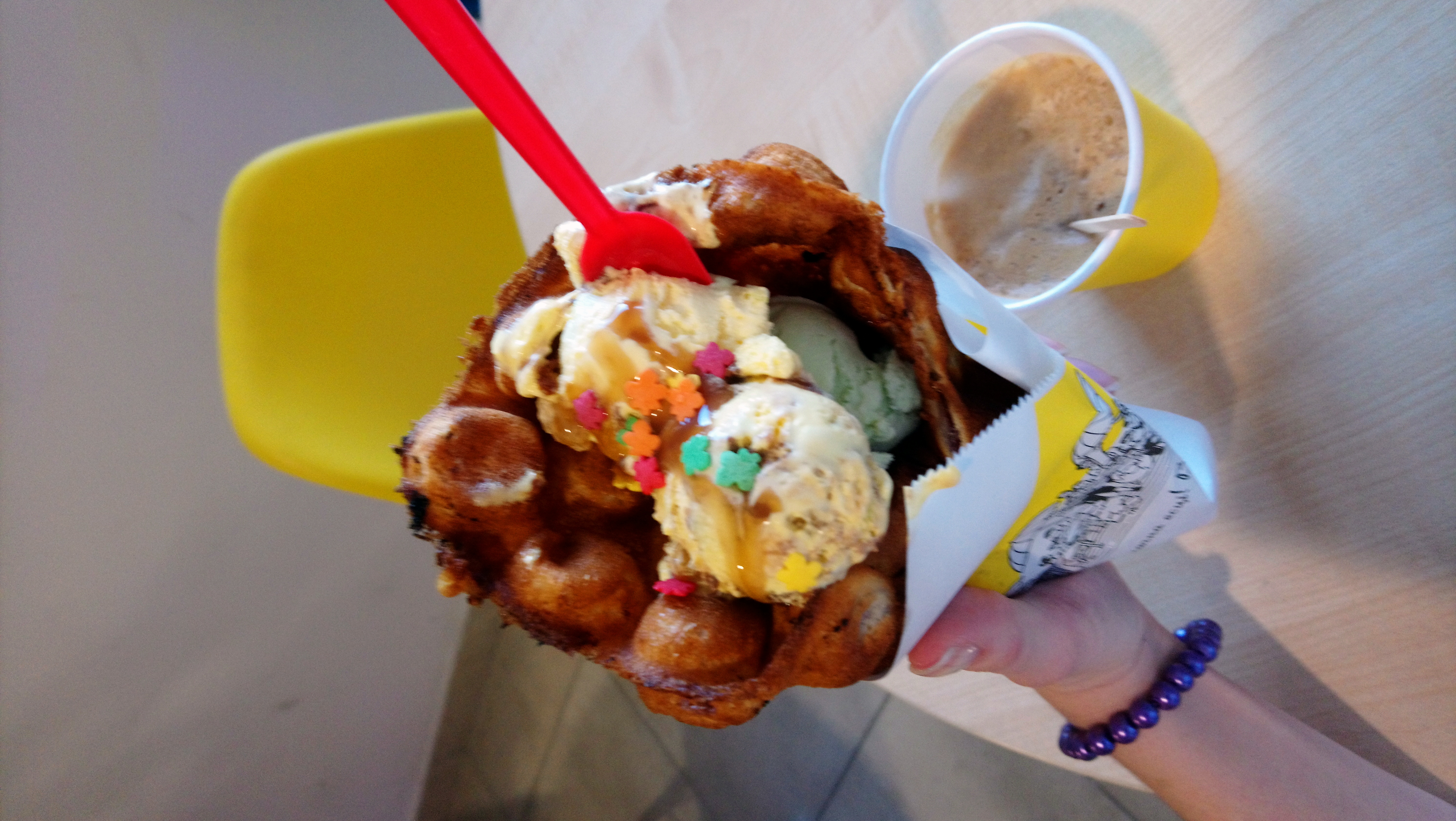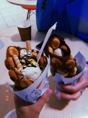 Взяли две разные вафли + 2 латте, как по мне ,простовато, несмотря на то,что вафля с мороженым выглядит эффектно,по вкусу оказалась менее вкусной,не хватило чего-то шоколадного,пресновато, с бананом и нутеллой было вкусно,но очень просто,вы такое можете легко сделать и дома,в любом случае попробовать стоит