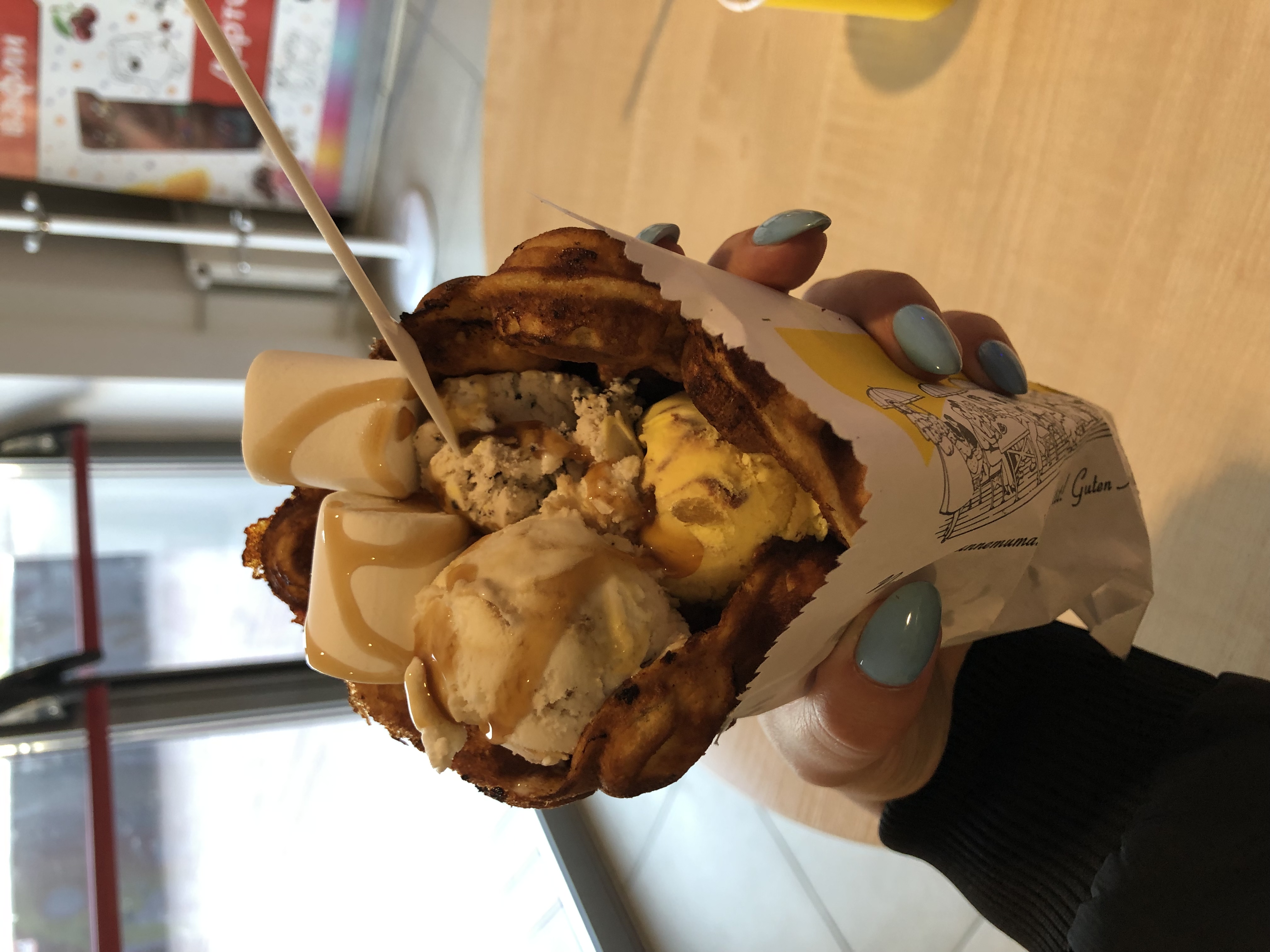 Очень вкусные вафли, и хорошее обслуживание. Бородатый мужчина был очень доброжелателен и предложил выбрать мороженое и коктейли на свой вкус,мы доверились и не пожалели! Подобрал отличные сочетания мороженого и открыл для нас божественный вкус кленового сиропа😋Все рекомендуем!😌