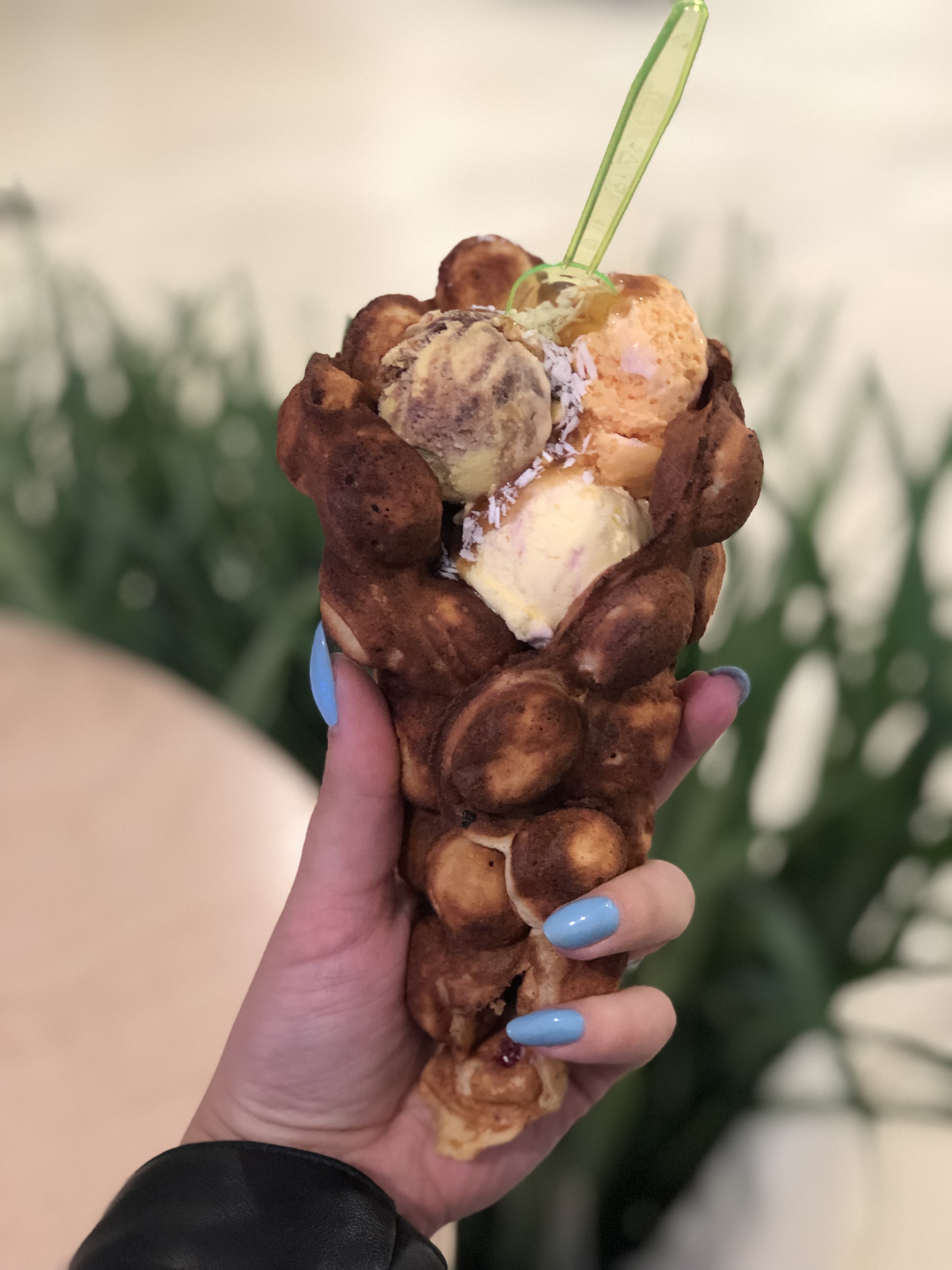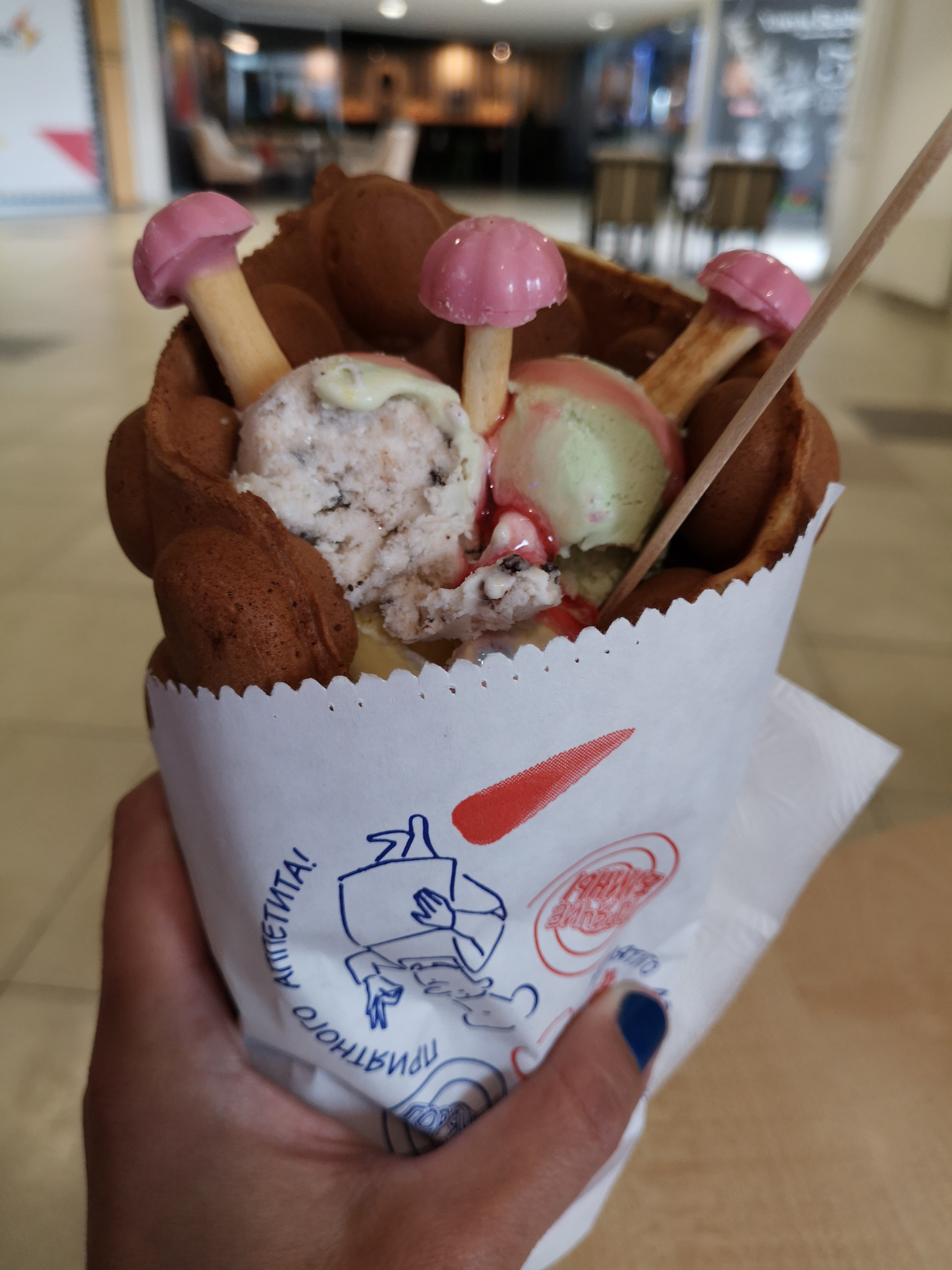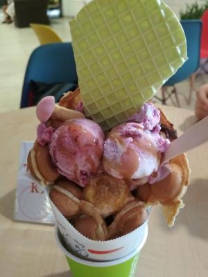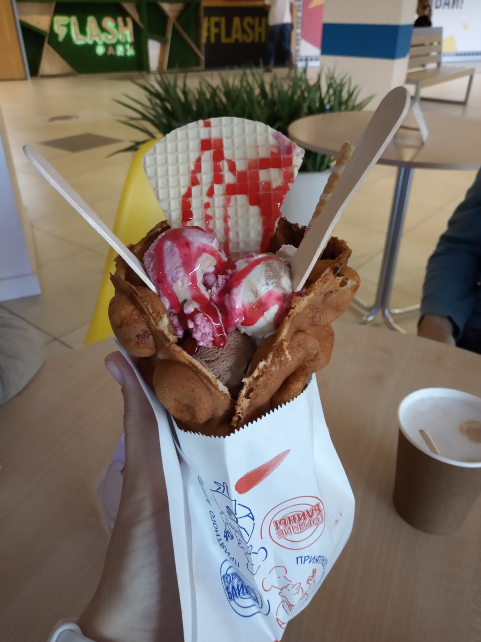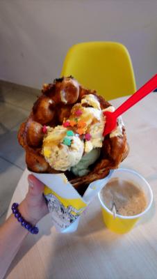 Очень вкусно!!!! Брали 2 разных сета: один с кофе, другой с коктейлем. Коктейль вкусный, прикольные шарики в нем. Понравилось, что можно выбрать любые 3 шарика мороженого для вафли и любой вкус коктейля. В целом приятное обслуживание, с душой, вафли очень вкусные, советую!