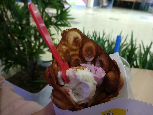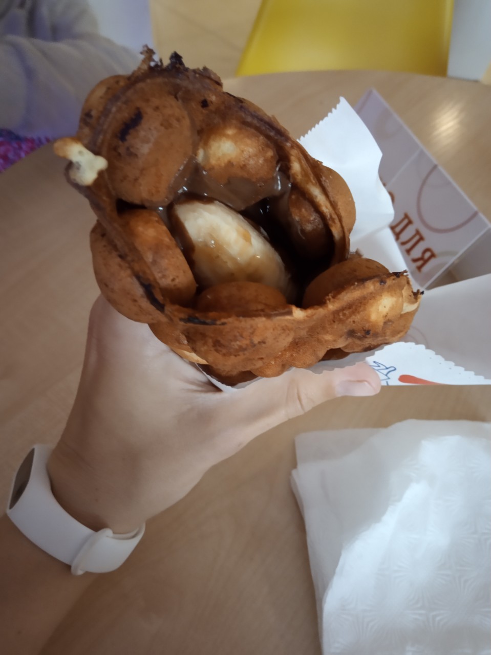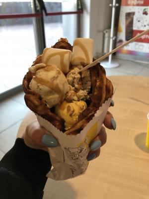 Очень вкусные вафли, мне с бананом и нутеллой даже больше понравилась, чем с мороженым))) Достаточно большие, чтобы плотно поесть!