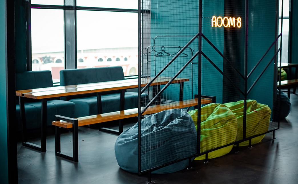 Уютные пространства с диванчиками, креслами-мешками и столами у панорамных окон с видом на стадион "Динамо"