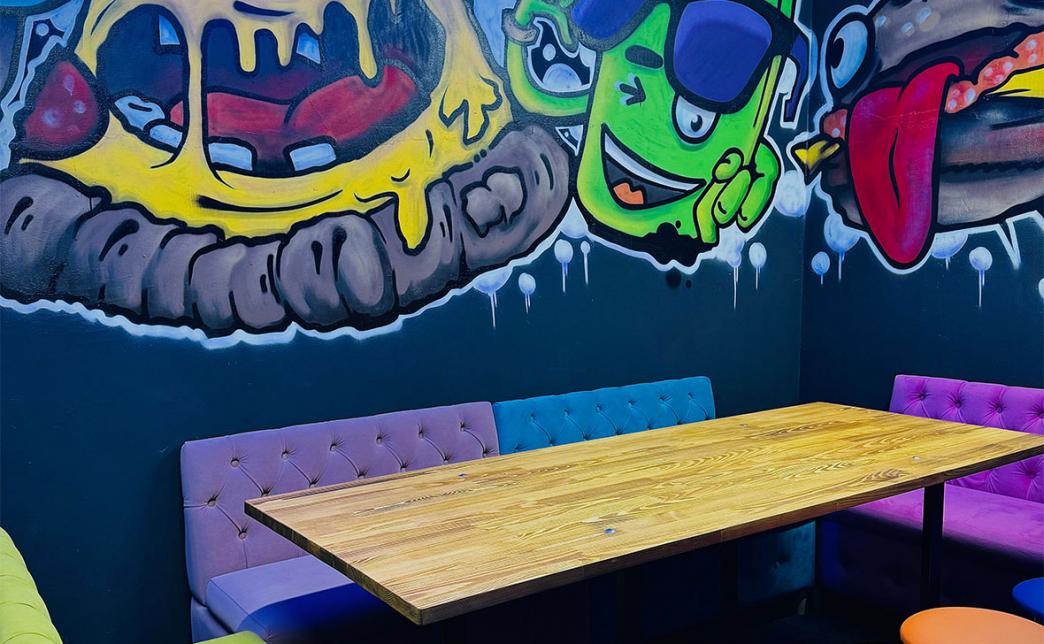 "Playtopia" - это эффектный коктейль из граффити, неона, ультрафиолета и ярких акцентов: например, Вы увидите в пространствах разноцветные диваны и кресла-мешки под цвет логотипа. Каждый гость попадает из серых красок в яркий удивительный мир игр. Особенно это актуально зимой!