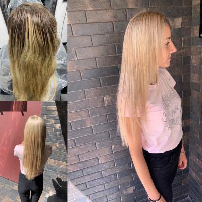 - мытье головы реконструирующим шампунем/кондиционером с растительными пептидами для сильно поврежденных и склонных к ломкости волос
