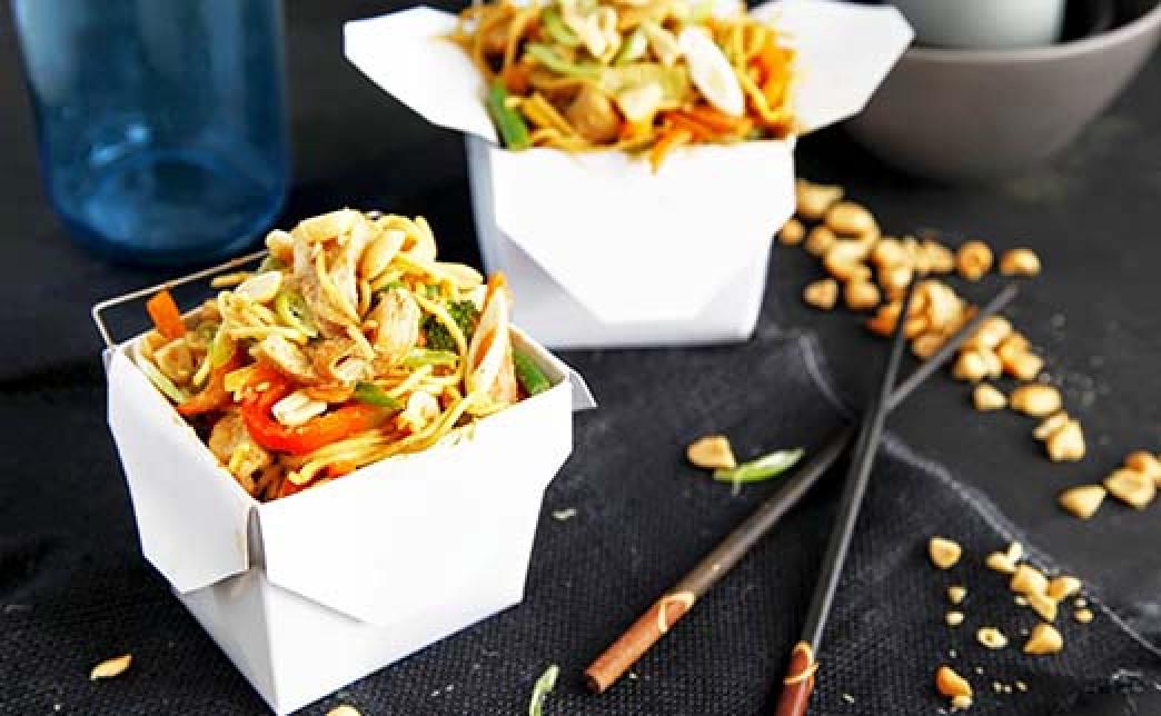 Лапша яичная (собственного приготовления), филе курицы, ростки сои, морковь, сладкий перец.