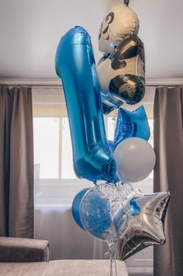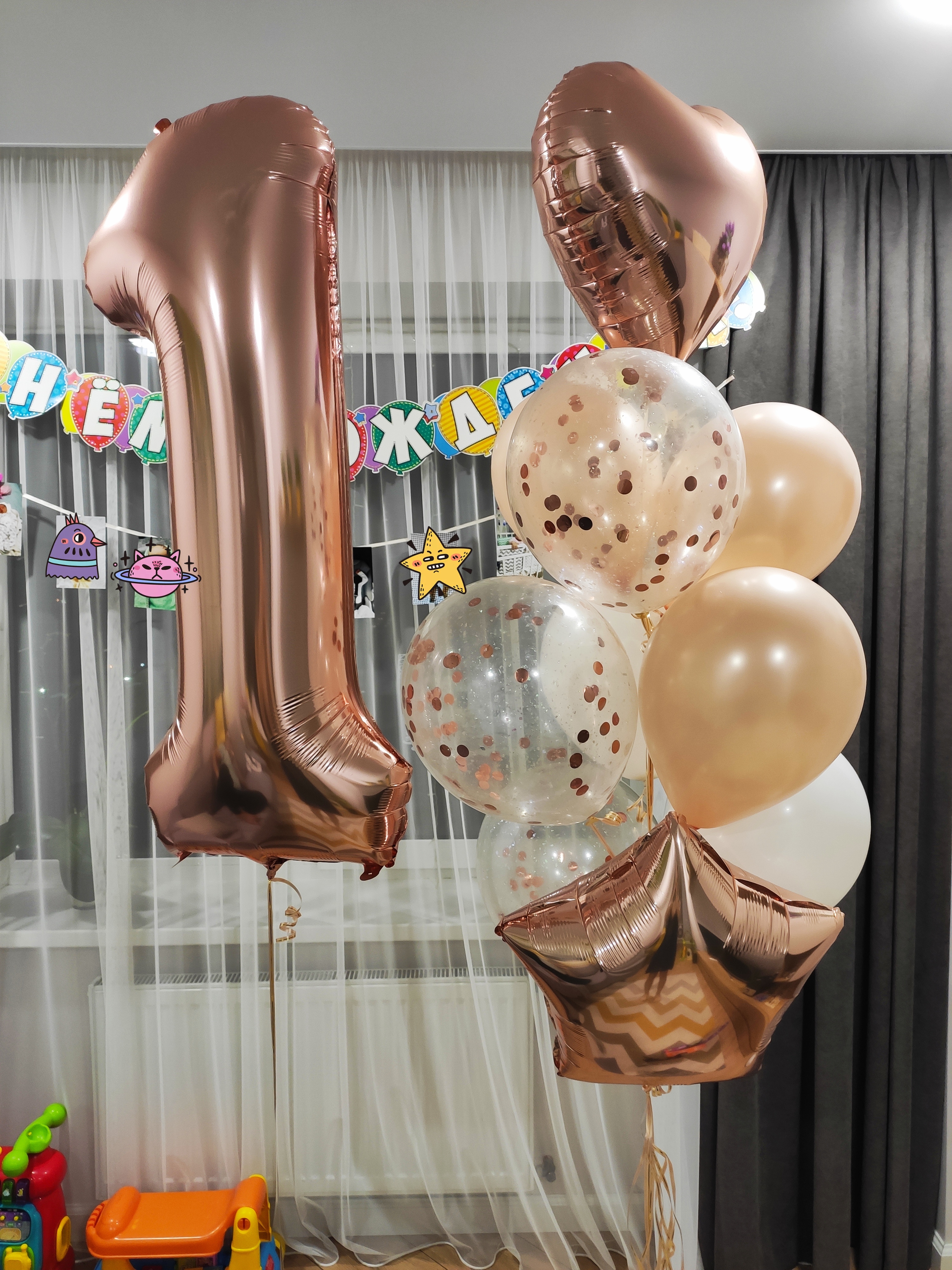 Шар цифра - 1 шт. Шар латексный без рисунка - 2 шт. Шар с конфетти - 3 шт. Цвет может меняться по желанию. Есть выбор. Композицию можно дополнить цифрой, фигурой.