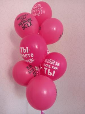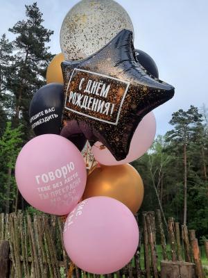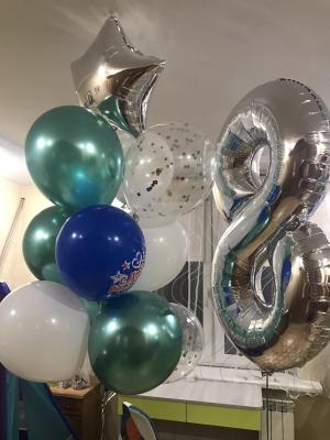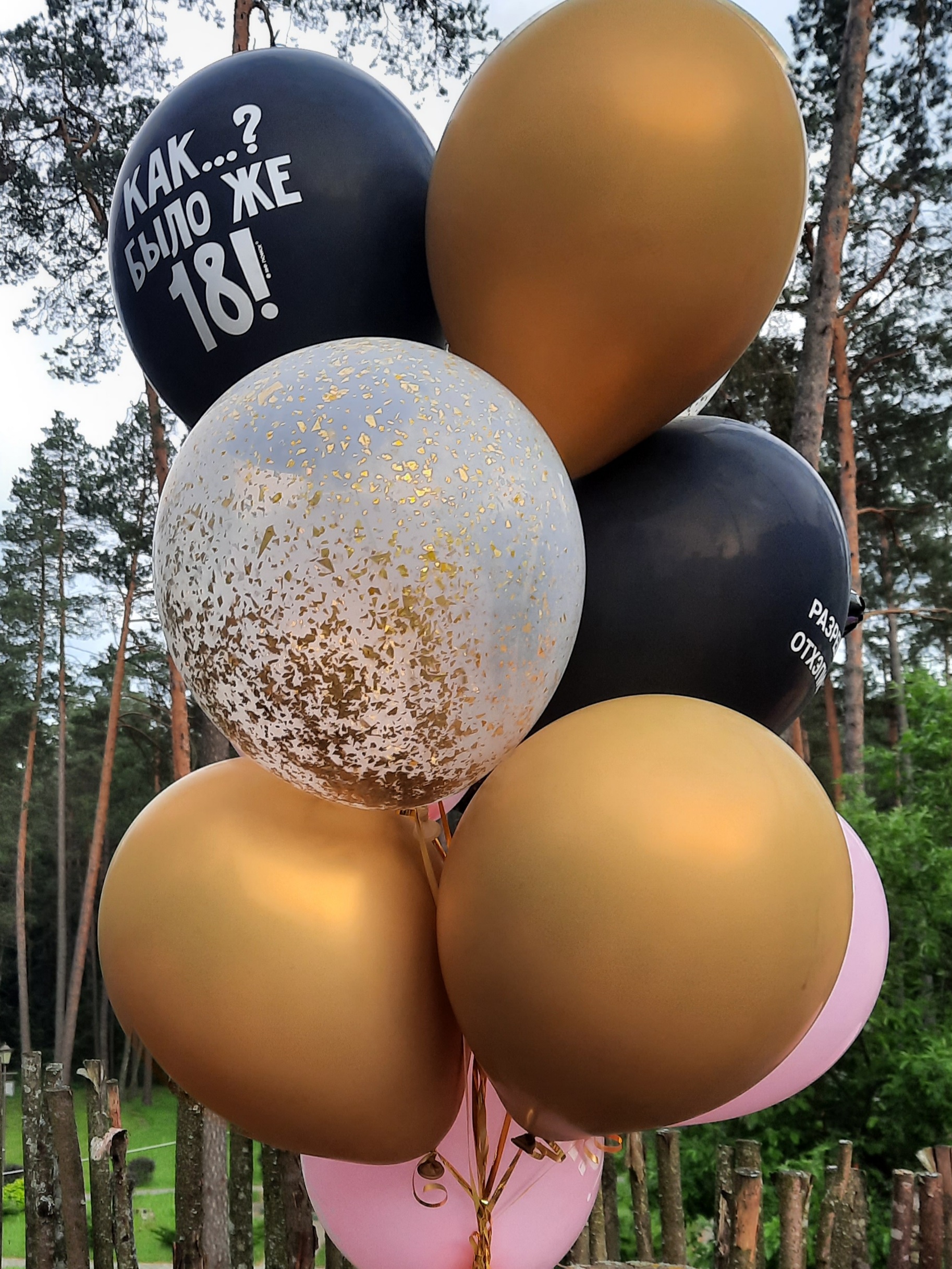 Шар латексный с надписями - 6 шт. Шар латексный с конфетти - 2 шт. Есть выбор. Композицию можно дополнить цифрой, фигурой.