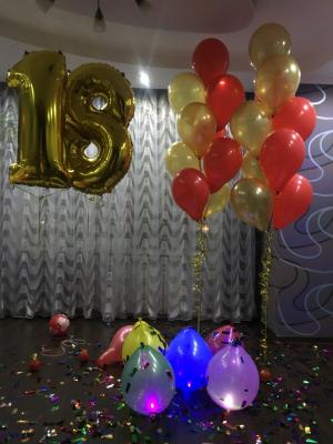 Добрый день! Цифра 18, два шара с перьями, два с конфети, сердечко фольгированное, два латексных с обработкой стоимость пожалуйста?