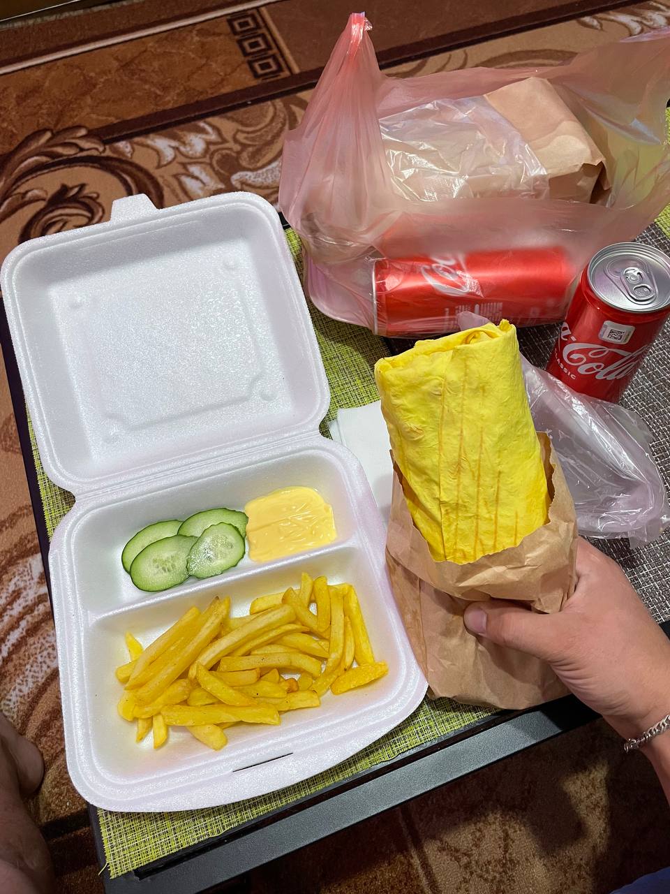 - шаурма с курицей (мясо курицы, капуста, морковь, помидоры, огурцы, курица, соус (чесночный или острый), 600 г)