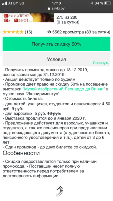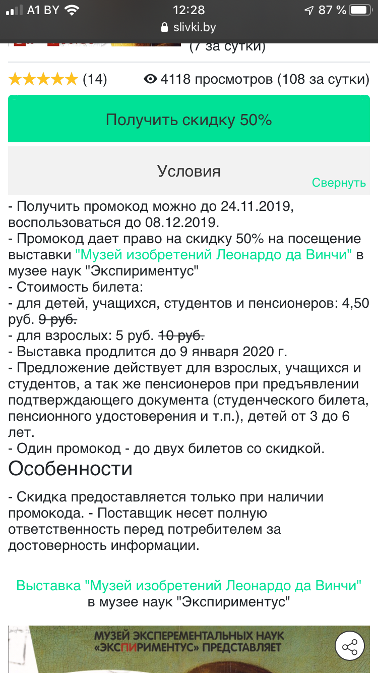 - Промокод дает право на скидку до 50% на посещение выставки "Музей изобретений Леонардо да Винчи" в музее наук "Экспириментус"