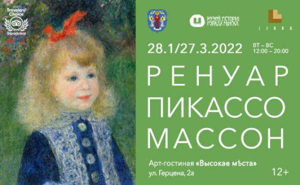 Музей истории города Минска и LIBRA приглашают всех посетить новый выставочный проект "Ренуар, Пикассо, Массон". В экспозиции будет представлено более 60 работ Огюста Ренуара, Пабло Пикассо и Андре Массона, выполненных в технике офорта, литографии и гелиогравюры, из частных коллекций Франции и США. Экспозицию можно будет увидеть в Арт-гостиной "Высокое место" (ул. Герцена, 2а) с 28 января по 27 марта 2022 г.