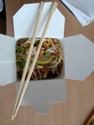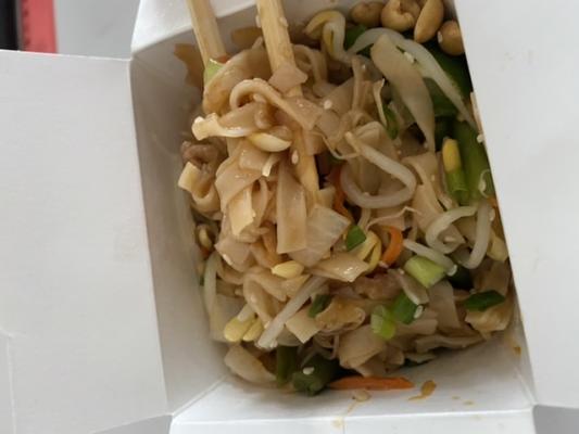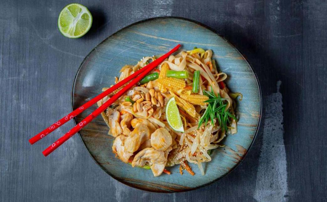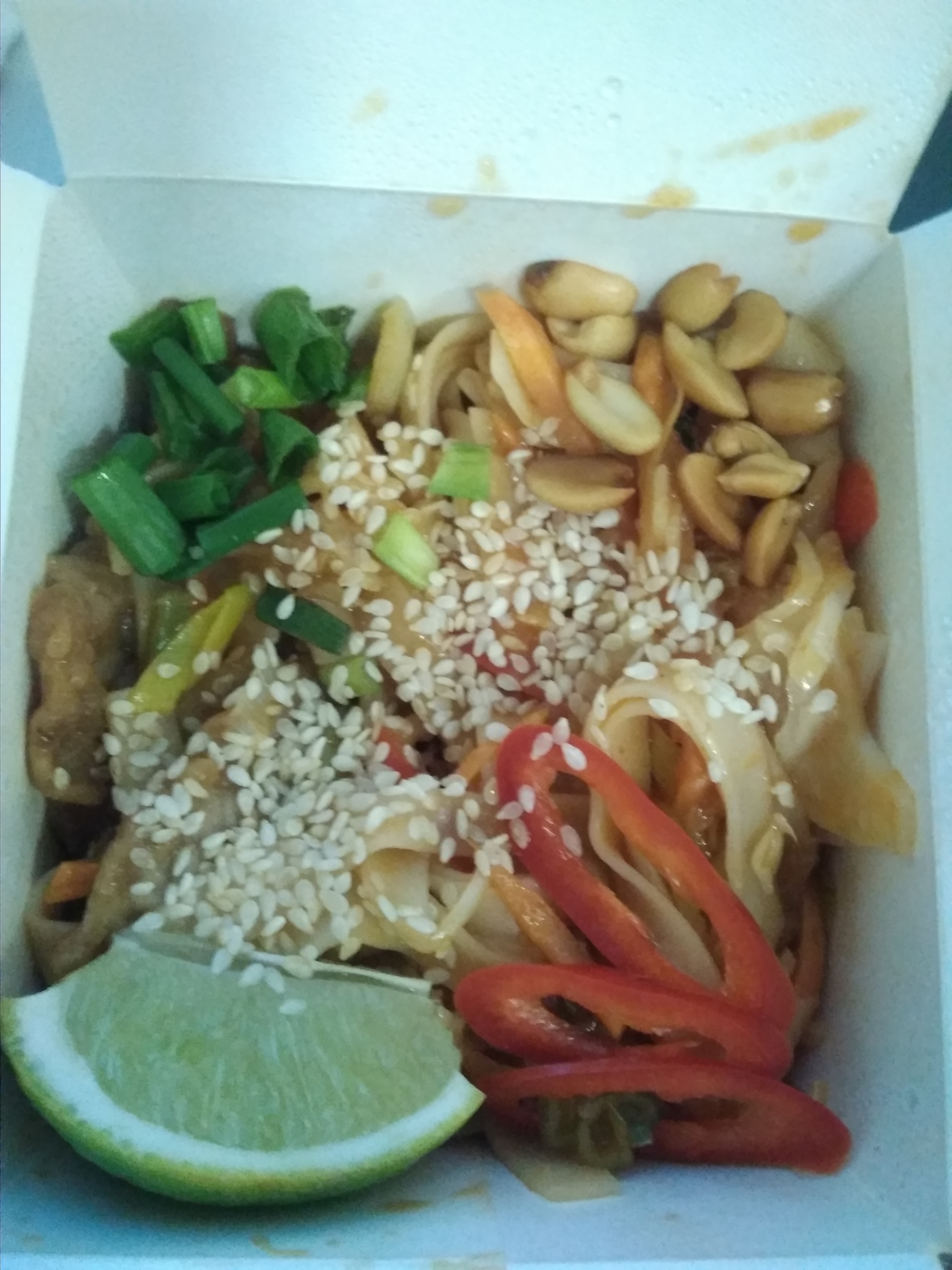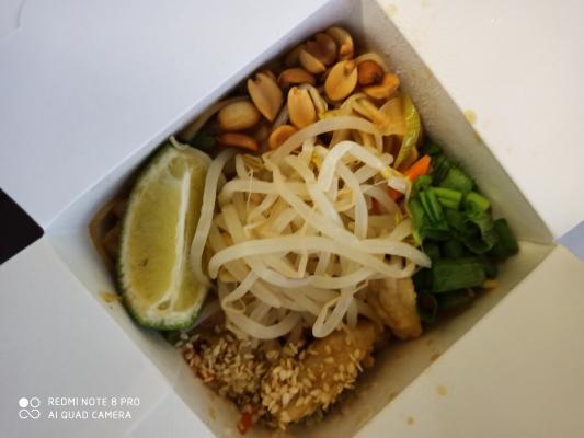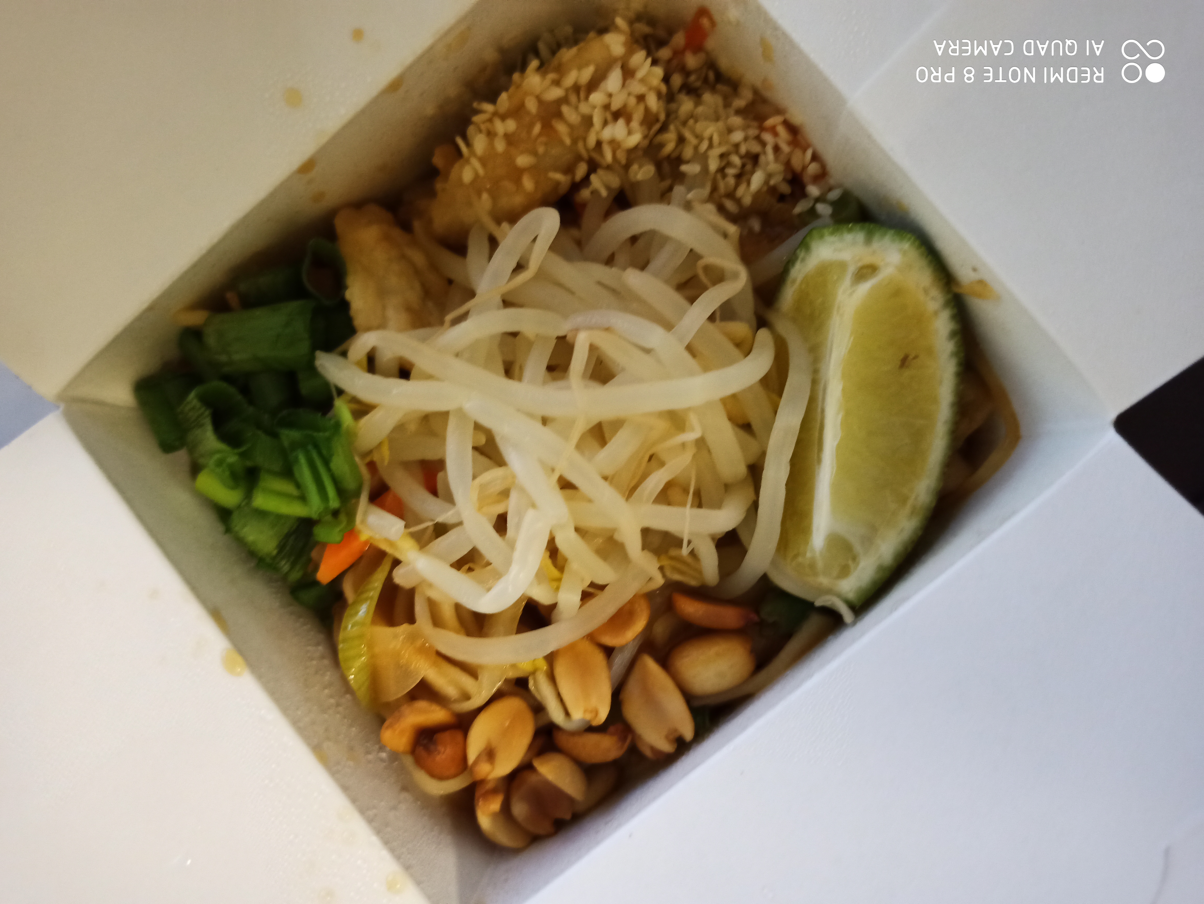 - куриное филе, лапша на выбор, соус устричный, маринованные ростки сои, початки кукурузы маринованные, фасоль стручковая, лук репчатый, лук-порей, капуста, морковь, лук зеленый, арахис жаренный, лайм, кунжут.