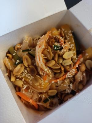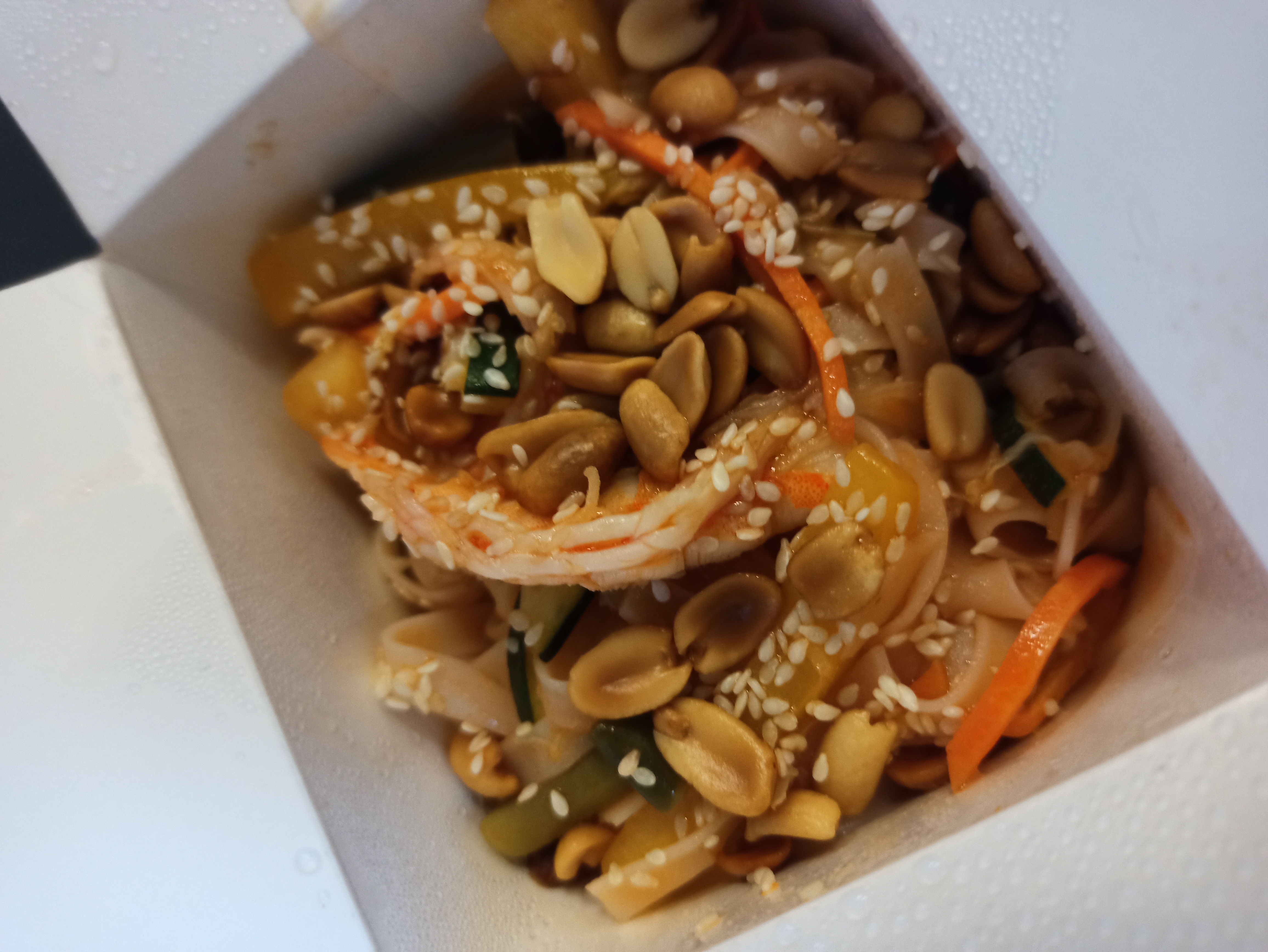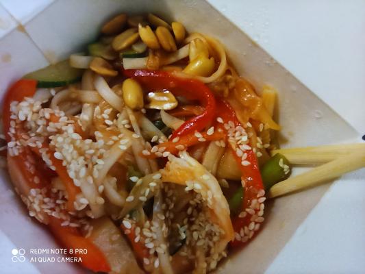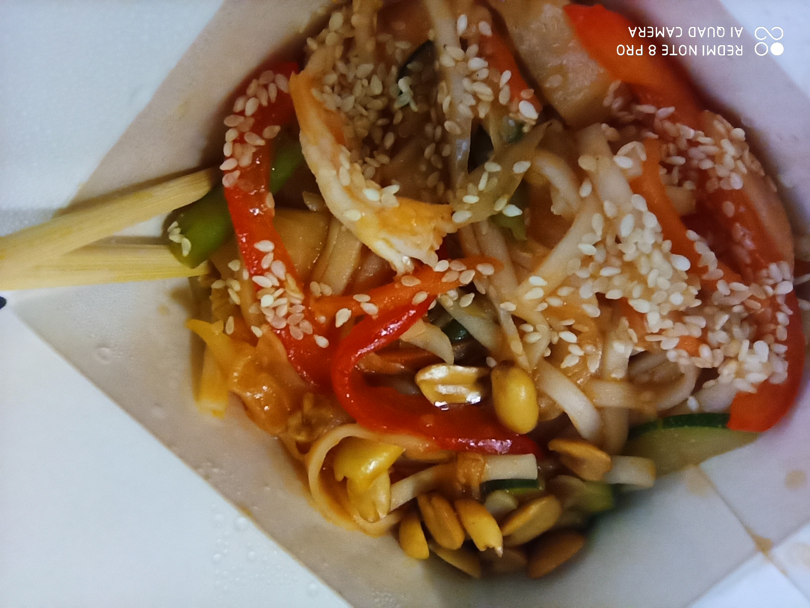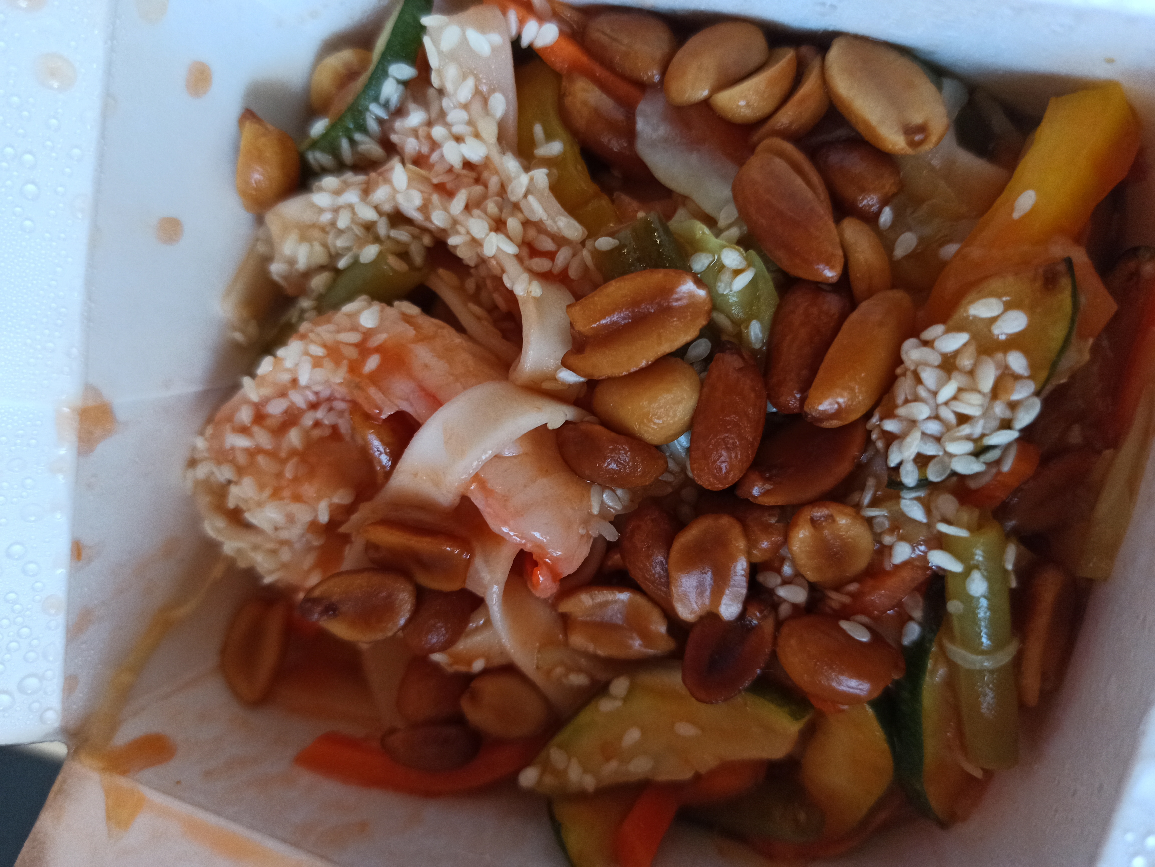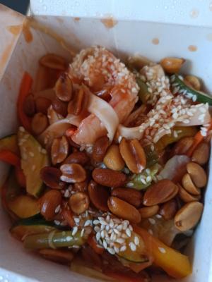 - креветки, лапша на выбор, соус кисло-сладкий, фасоль стручковая, ананас консервированный, кунжут, цукини, перец, морковь, капуста, арахис.
