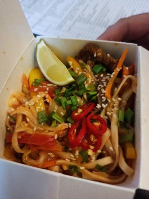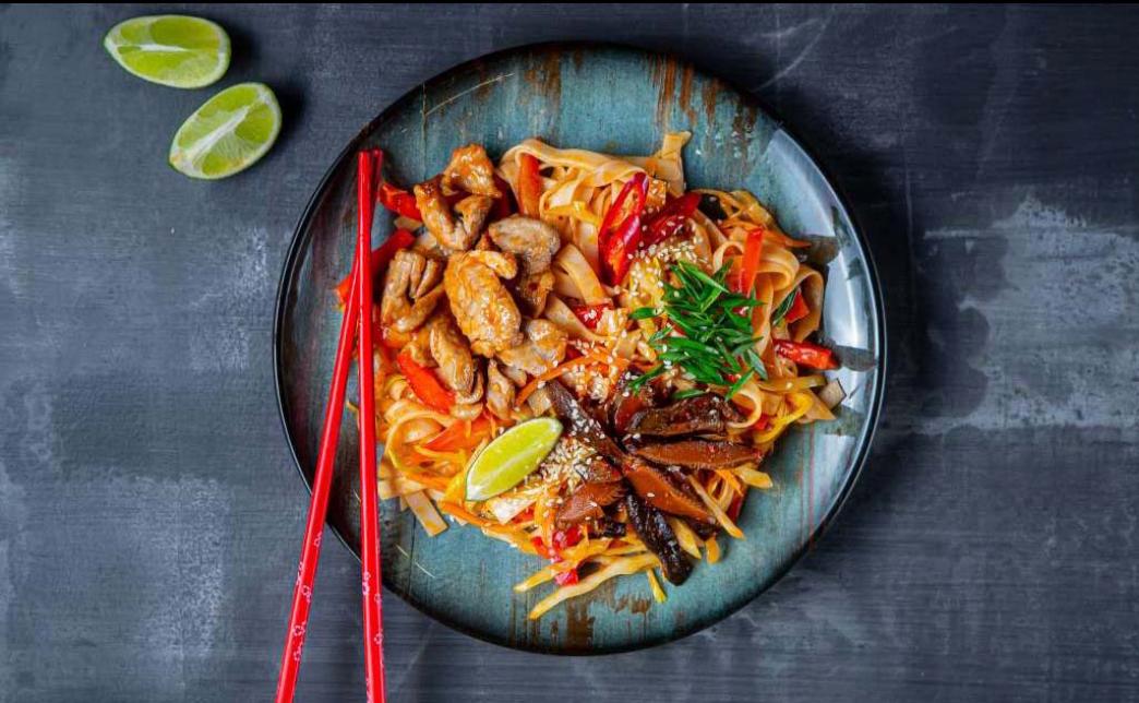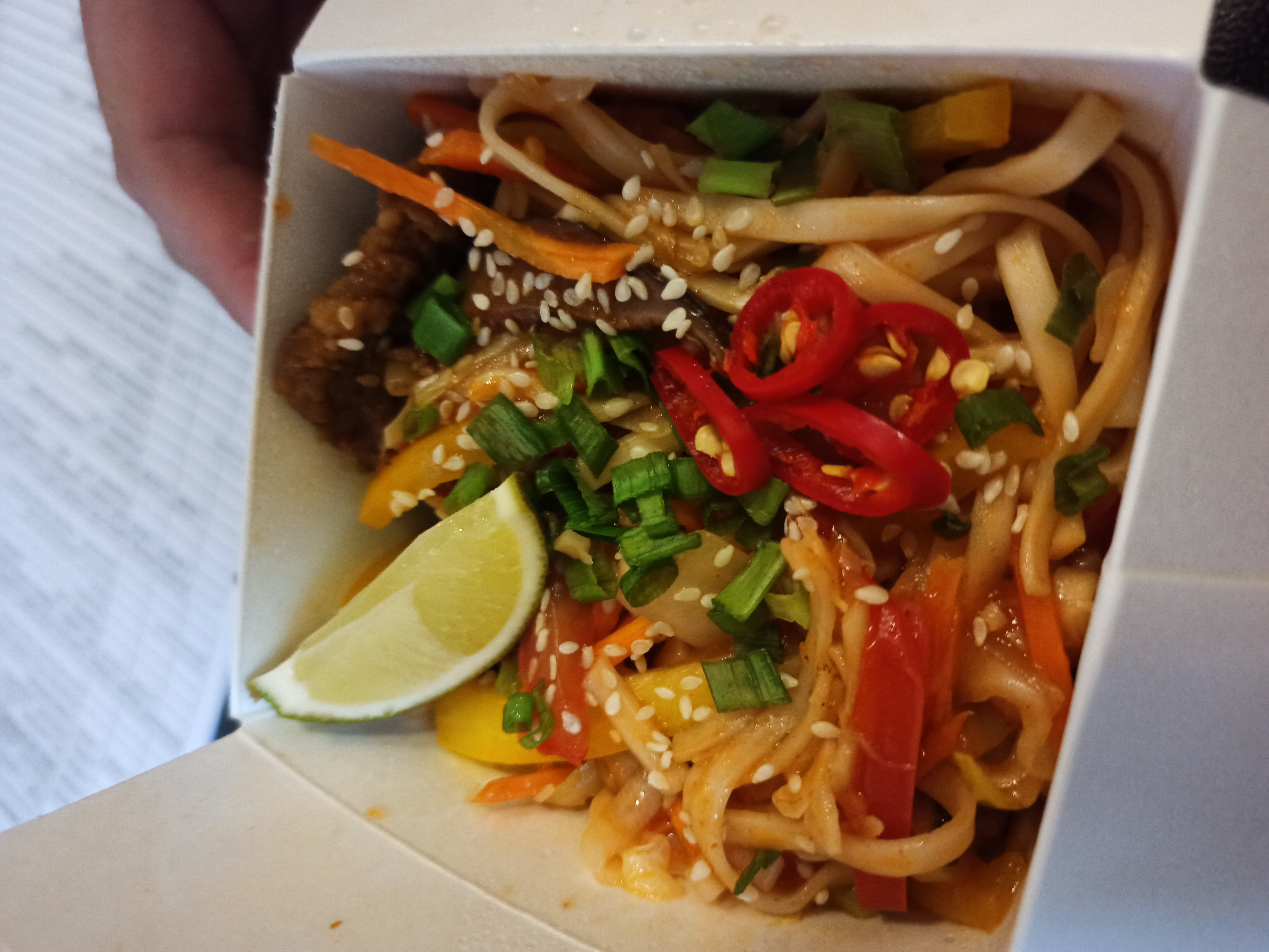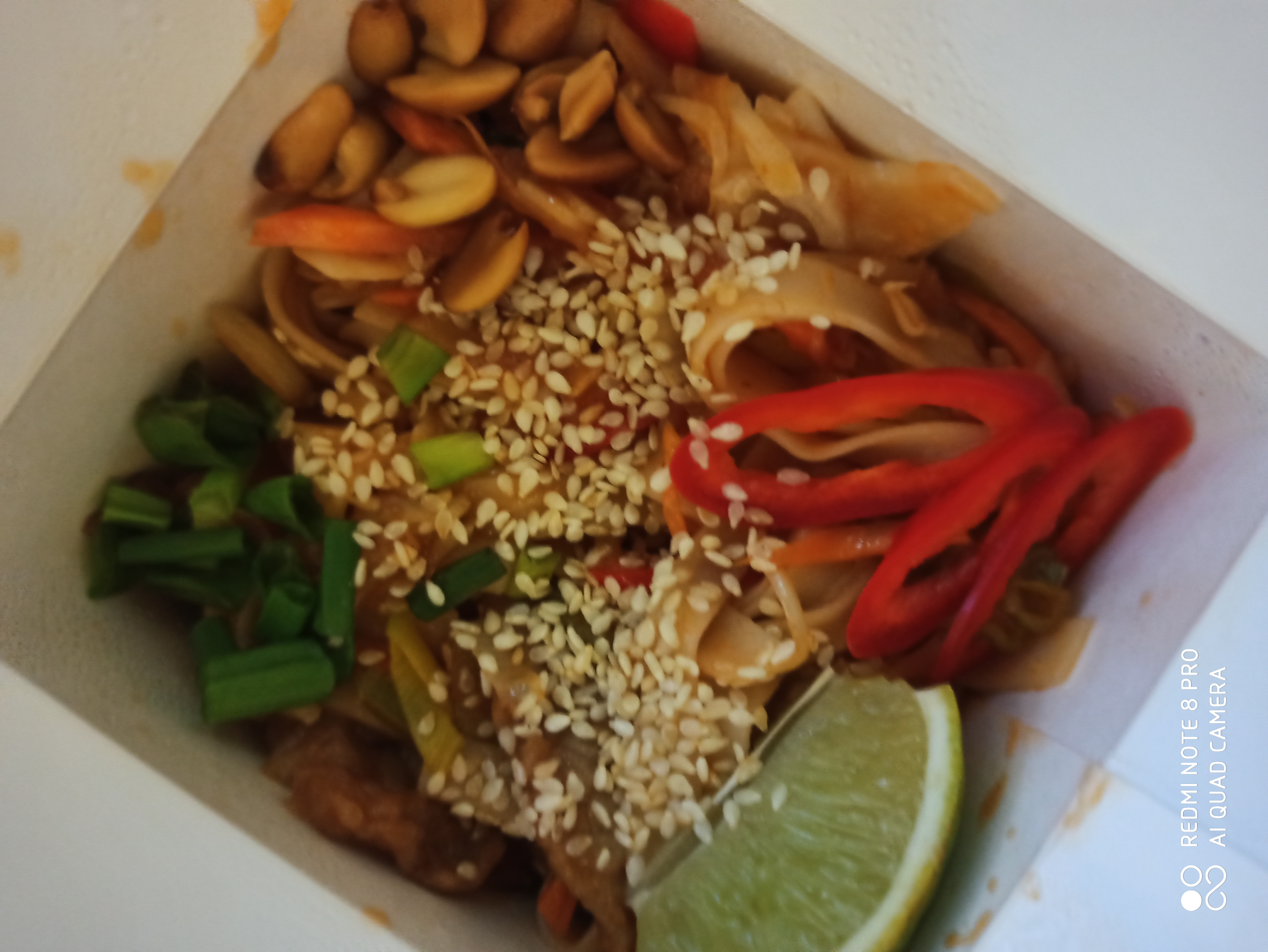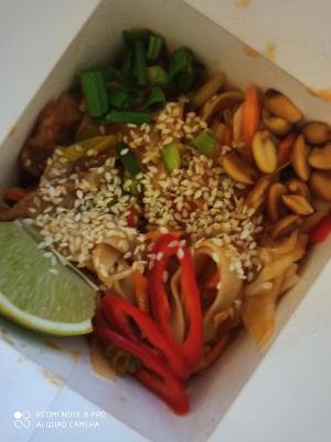 - куриное филе, лапша на выбор, соус острый, грибы шиитаке, перец сладкий, перец чили, лук репчатый, лук-порей, лайм, кунжут, помидор, лук зеленый, капуста, морковь.