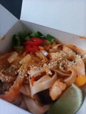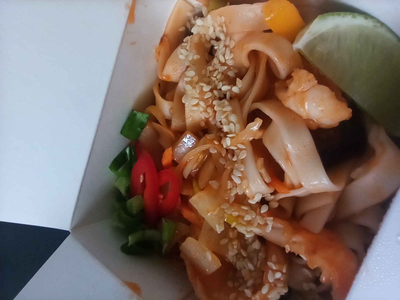 - креветки, лапша на выбор, соус острый, грибы шиитаке, перец сладкий, перец чили, лук репчатый, лук-порей, лайм, кунжут, помидор, лук зеленый, капуста, морковь.
