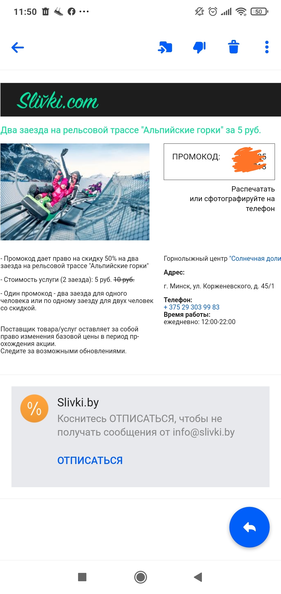 - Промокод дает право на скидку 50% на два заезда на рельсовой трассе "Альпийские горки"