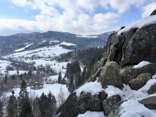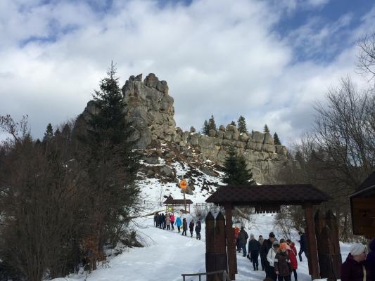 * Дополнительная экскурсия выезд в Карпаты.(доп.плата, от 25 чел) Урицкие скалы в Сколах являются одним из семи чудес Украины. Ни в одном другом горном массиве Европы нет аналога этого памятника природы и археологии. В XI-XIII вв. здесь была древнерусская крепость для защиты от татаро-монгольских завоевателей. От нее остались остатки стен и строительных конструкций, а также вырубленные в скалах гроты, колодцы, подземные ходы.