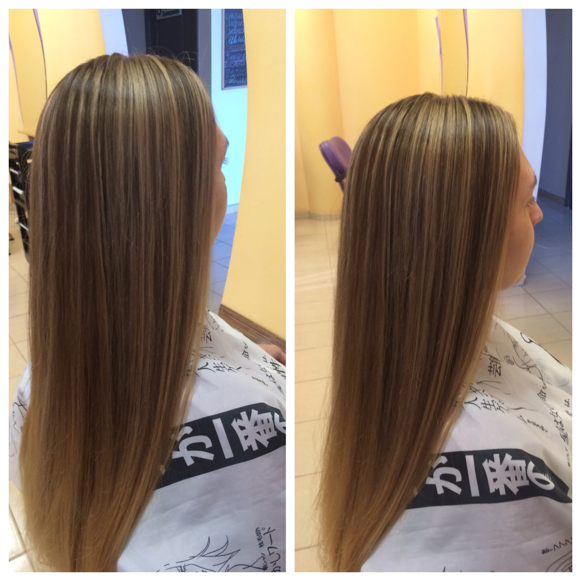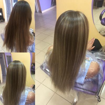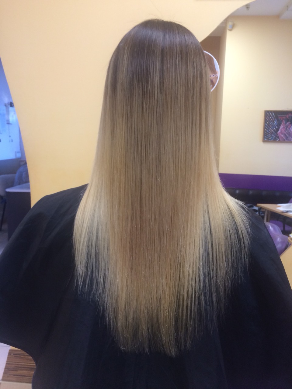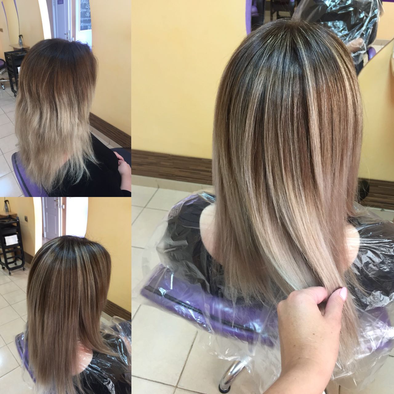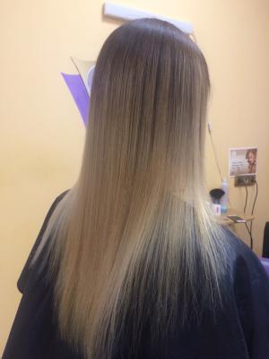 Такая технология окрашивания позволяет создать на Ваших волосах плавный переход от светлых кончиков к более темным корням, делая цвет более глубоким и добавляя объем Вашей прическе. Выглядит такой цвет очень естественно за счет эффекта натурально выгоревших волос.