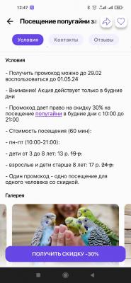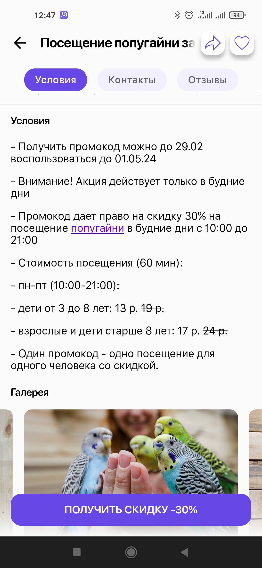 - Промокод дает право на скидку 50% на посещение в будние дни попугайни